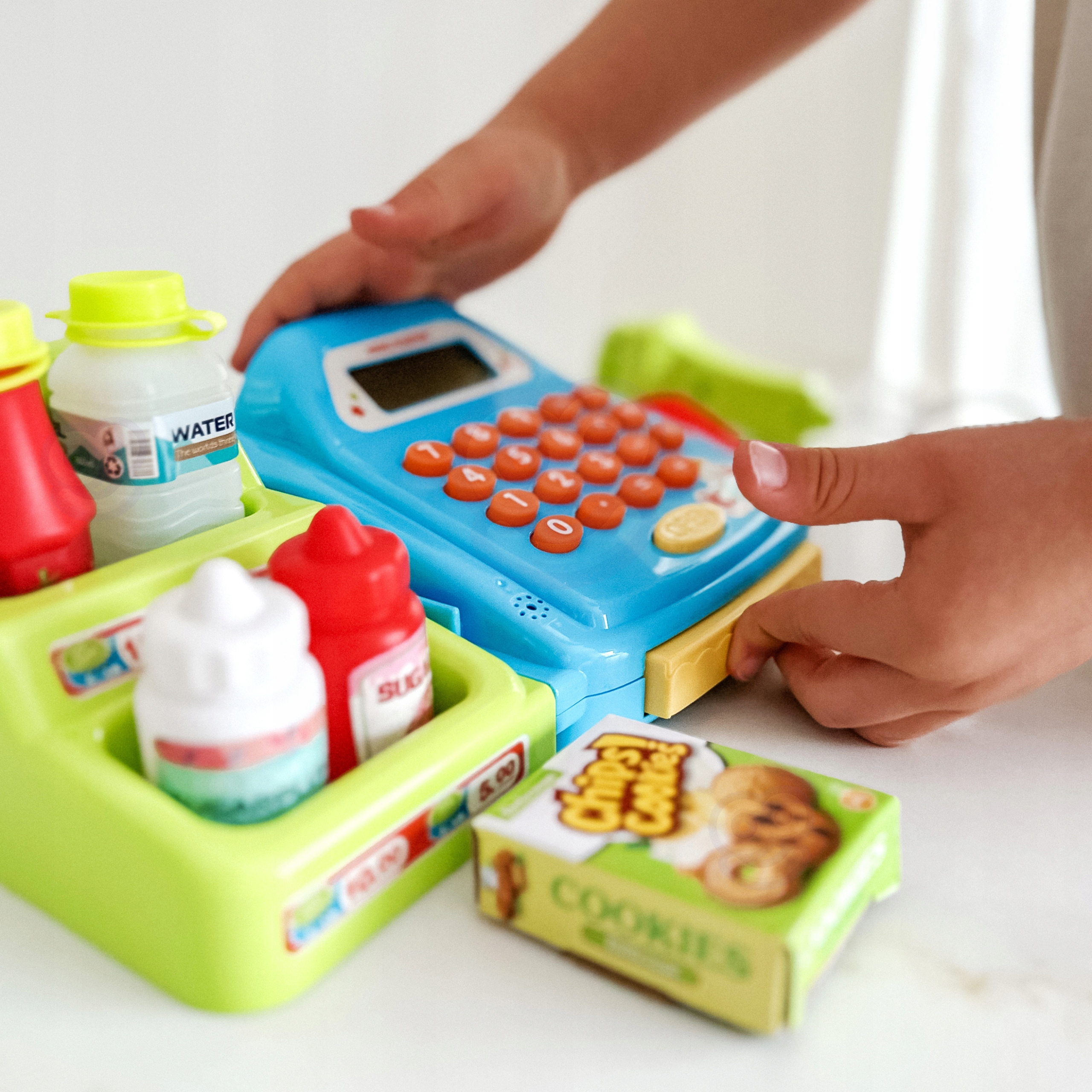 Кассовый аппарат магазина с полкой от бренда WOOPIE — идеальный вариант для игры. Дети могут выбрать продукты, которые хотят купить, а затем заполнить их на кассе. Они будут использовать ридер для сканирования файлов cookie и других продуктов. Далее покупатель может оплатить деньгами или платежной картой.