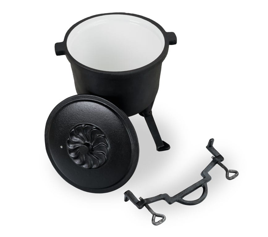 Оригинальный бойлер объемом 8 л изготовлен из высококачественного чугуна, устойчивого к самым высоким температурам. Внутренняя часть 8-литрового казана и крышка казана покрыты толстым слоем эмали, предотвращающей прилипание продуктов. Котел имеет специальное вентиляционное отверстие в крышке, которое регулирует давление внутри котла, что делает его 100% безопасным. Казан может стоять прямо у огня, а благодаря удобной ручке его также можно подвешивать над огнем. Изделие также имеет съемные ножки, благодаря которым котел можно разместить в камине или непосредственно в очаге Кеффнера.