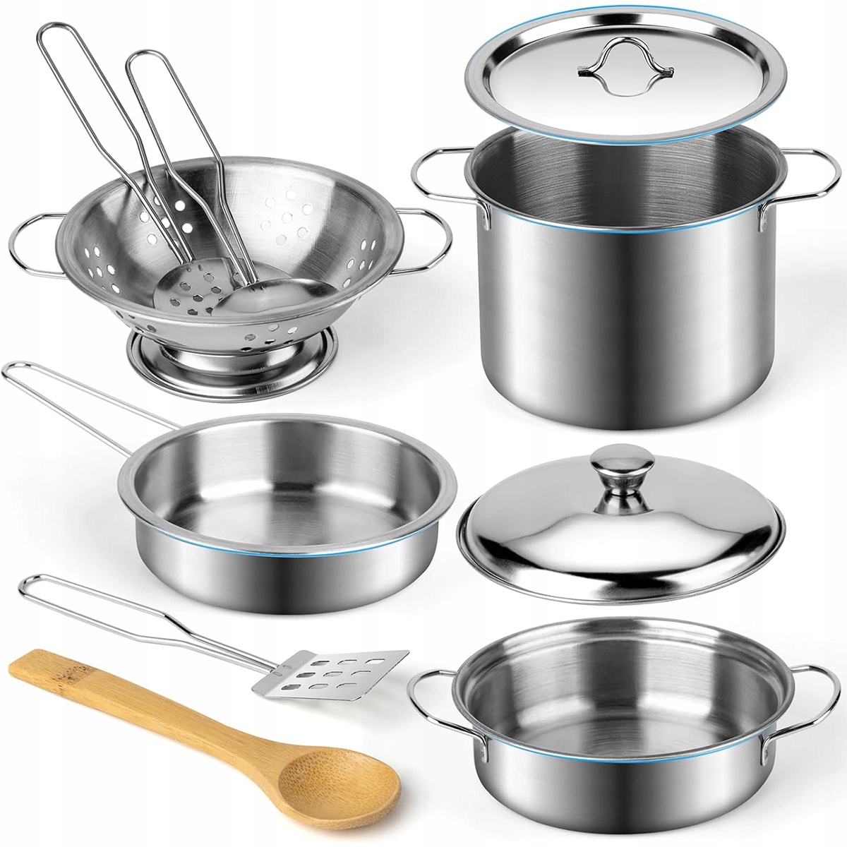 🥦В этот детский кухонный набор игрушек входят 4 кастрюли и сковородки из нержавеющей стали, деревянная посуда, фартук, колпак повара, а также игрушка для измельчения овощей. Отлично подходит для ролевых игр и воображения детей.