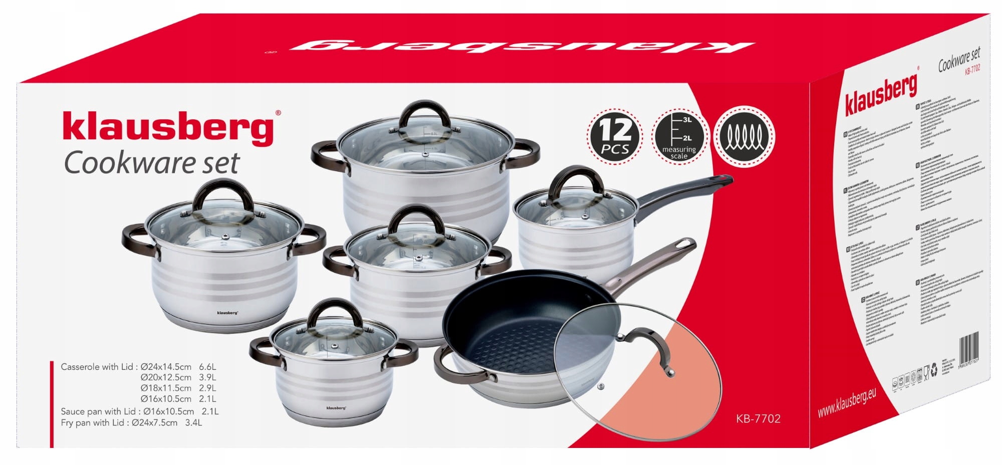Набор из 6 кастрюль из нержавеющей стали от KLAUSBERG. Хромоникелевая нержавеющая сталь, из которой изготовлен весь комплект, прочна и долговечна. Используемый материал не только наилучший, но и великолепно выглядит, исключительно легко чистится и обладает бактерицидными свойствами. Посуда в этом наборе имеет ферромагнитное 5-слойное акутермическое дно с алюминиевым слоем, гарантирующим отличное распределение и сохранение тепла. Все кастрюли можно использовать на всех типах плит, включая индукционные. Приклепанные ручки цвета ГРАФИТ (полированные). Внутри каждой кастрюли находится практичный мерный стакан.