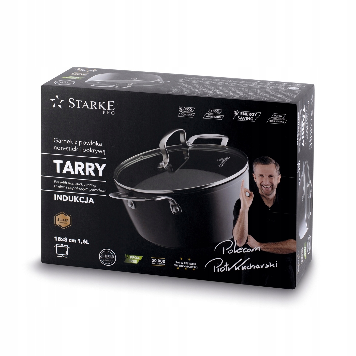 Индукционная кастрюля Starke Pro Tarry объемом 1,6 л с антипригарным покрытием и крышкой изготовлена из алюминия, имеет толстые стенки и защищает продукты от пригорания. Его корпус выкован из цельного листа металла методом ковки. Это делает его очень прочным и хорошо проводит тепло. Он также идеально сбалансирован, что в сочетании с приклепанными ручками из нержавеющей стали обеспечит высокий уровень комфорта использования. Изделие работает на любом типе плиты, поскольку имеет индукционное дно. Это ускоряет приготовление блюд и экономит электроэнергию. Прочность внутренней поверхности кастрюли Тарри размером 18 х 8 см основана на двухслойном антипригарном покрытии AEROLITE (толщина 50-65 микрометров). Он не содержит вредных веществ (например, ПФОК), тверд, имеет отличную адгезию и естественную текстуру, выдерживает до 50 000 циклов истирания. В комплект также входит стеклянная крышка. Благодаря ему можно тушить продукты и удобно регулировать количество пара внутри. Коллекцию Starke Pro Tarry также протестировал профессиональный шеф-повар Петр Кухарский. Он рекомендует его для длительного домашнего использования.