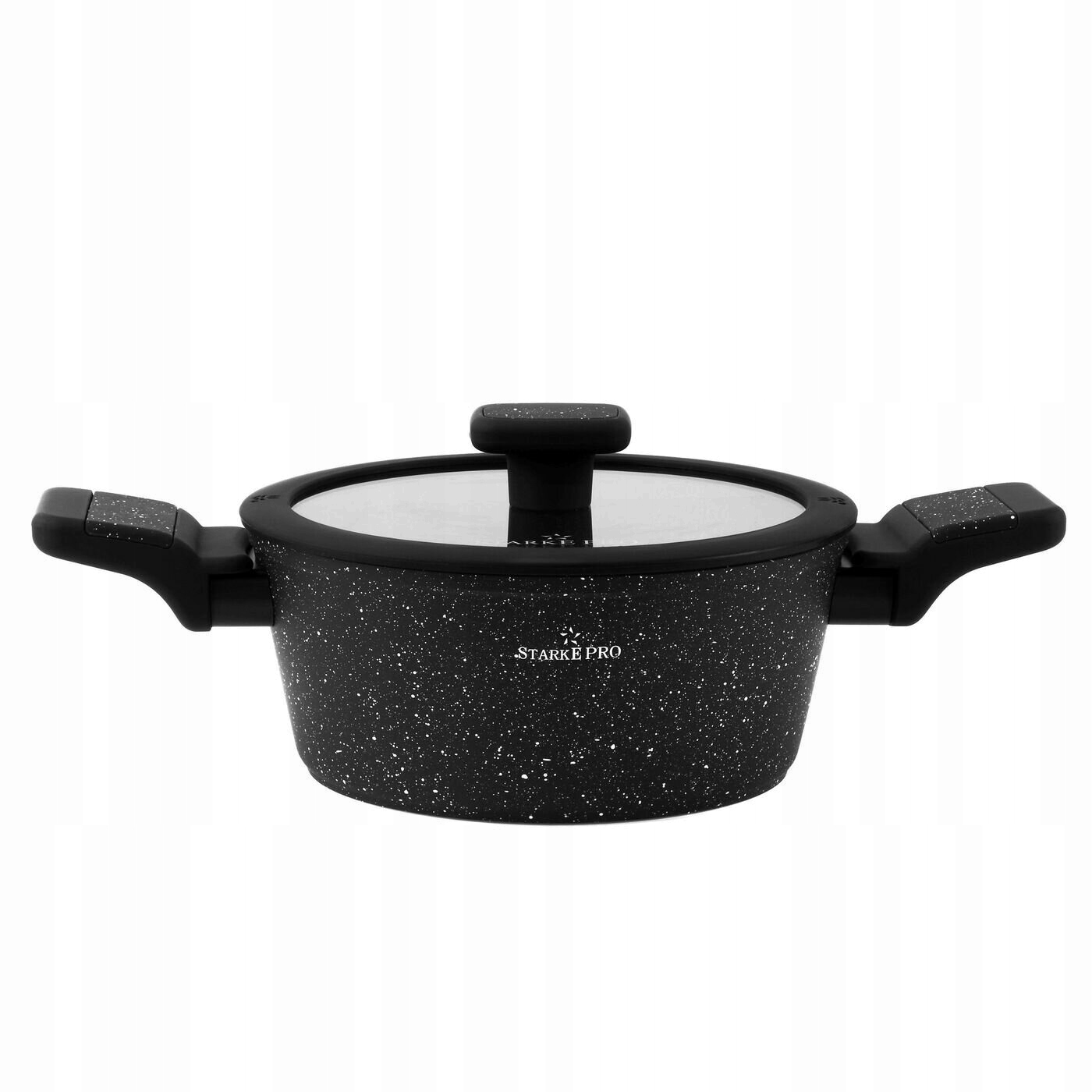 Индукционная кастрюля Starke Pro Ceres Marble объемом 1,6 л с крышкой изготовлена из алюминия, имеет толстые стенки и защищает продукты от пригорания. Его корпус выкован из цельного листа металла методом ковки. Это делает его очень прочным и хорошо проводит тепло. Он также идеально сбалансирован, что в сочетании с мягкими на ощупь ручками обеспечит вам высокий уровень комфорта использования и защиту от ожогов и выскальзывания из рук при его переноске. Изделие работает на любом типе плиты, поскольку имеет индукционное дно. Это ускоряет приготовление блюд и экономит электроэнергию. Прочность внутренней поверхности горшка Ceres Marble 18 см основана на трехслойном антипригарном гранитном покрытии AEROLITE PLUS (толщина 80-120 микрометров). Он не содержит вредных веществ (например, ПФОК), чрезвычайно тверд, имеет естественную текстуру и выдерживает до 100 000 циклов истирания. В комплект также входит стеклянная крышка. Благодаря ему можно тушить продукты и удобно регулировать количество пара внутри. Коллекцию Starke Pro Ceres Marble с мраморным покрытием также протестировал профессиональный шеф-повар Петр Кухарский. Он рекомендует его для длительного использования на домашней кухне.