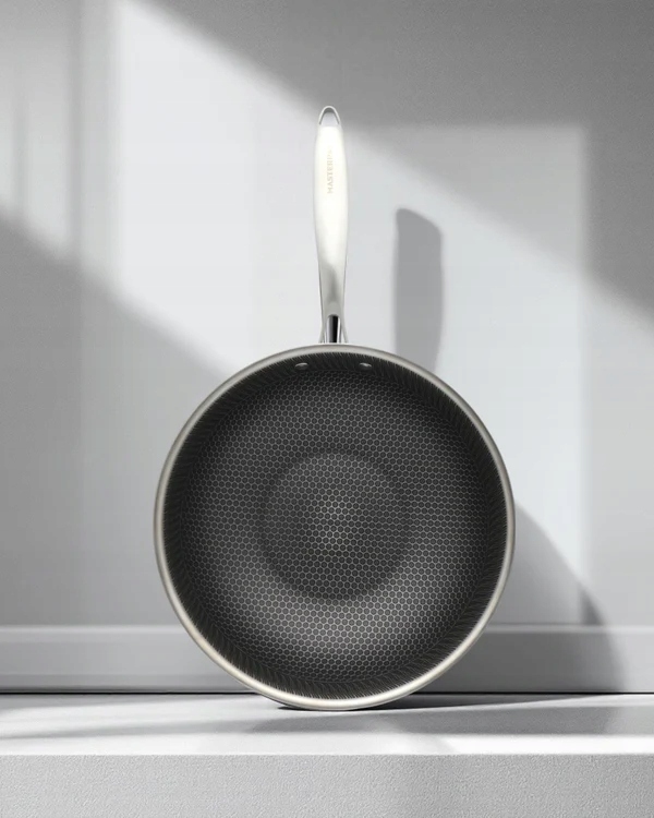 - Внутренняя часть вока покрыта сотовой структурой, , которая обеспечивает даже распределение жира и снижает риск прикования блюд. Несущий вок удобен в руке и обеспечивает стабильность во время приготовления.