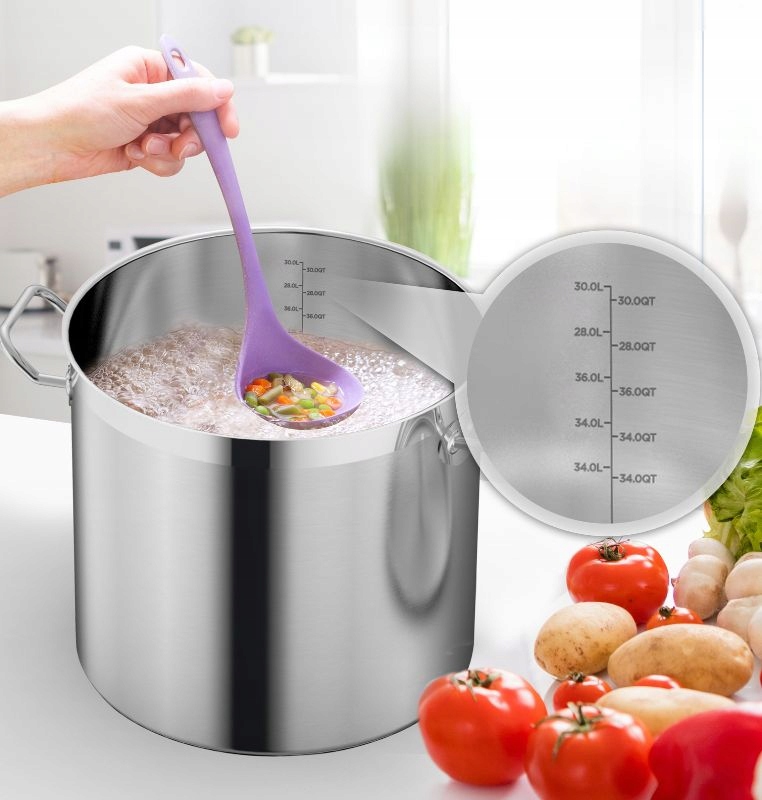 ➡️ Вместительная, прочная и долговечная кастрюля объемом 27 литров. Изготовлен из высококачественной полированной нержавеющей стали. Он имеет стальную крышку и приклепанные ручки, что обеспечивает комфорт и безопасность использования даже при больших объемах продуктов.