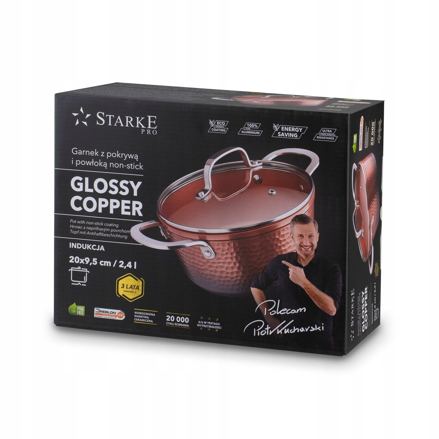 Индукционная кастрюля Starke Pro Glossy Copper объемом 2,4 л с антипригарным покрытием и крышкой изготовлена из алюминия, имеет толстые стенки и защищает продукты от прилипания. Его корпус выкован из цельного листа металла методом ковки. Это делает его очень прочным и хорошо проводит тепло. Он также идеально сбалансирован, что в сочетании с приклепанными ручками из нержавеющей стали обеспечит высокий уровень комфорта использования. Изделие работает на любом типе плиты, поскольку имеет индукционное дно. Это ускоряет приготовление блюд и экономит электроэнергию. Прочность внутренней поверхности кастрюли Glossy Copper диаметром 20 см обеспечивается антипригарным покрытием GREBLON C3+, усиленным керамическим слоем. Он не содержит вредных веществ (например, ПФОК), тверд, разработан немецкой маркой WEILBURGER и выдерживает до 20 000 циклов истирания. В комплект также входит стеклянная крышка. Благодаря ему можно тушить продукты и удобно регулировать количество пара внутри. Грубый и современный дизайн кастрюли Glossy Copper подчеркивается эффектом чеканки на внешней поверхности корпуса и красивым медным цветом. Использование модели в духовке (без крышки и при температуре до 220 градусов С) обжигает нержавеющую сталь, поэтому ее ручки за это время могут пожелтеть (это явление не влияет на функциональность изделия и является вполне естественным). ). Коллекцию Starke Pro Glossy Copper также протестировал профессиональный шеф-повар Петр Кухарский. Он рекомендует его для длительного домашнего использования. Серия получила высший балл в общих тестах качества и останется в вашей коллекции на долгие годы, независимо от того, какой горшок вы выберете.