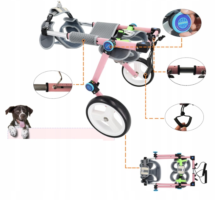 - [Используемые материалы и характеристики]: легкая и прочная коляска для собак имеет высокую твердость и небольшой вес. , что может обеспечить общую прочность инвалидной коляски, а материал ремня мягкий и не причинит вреда владельцам домашних животных.