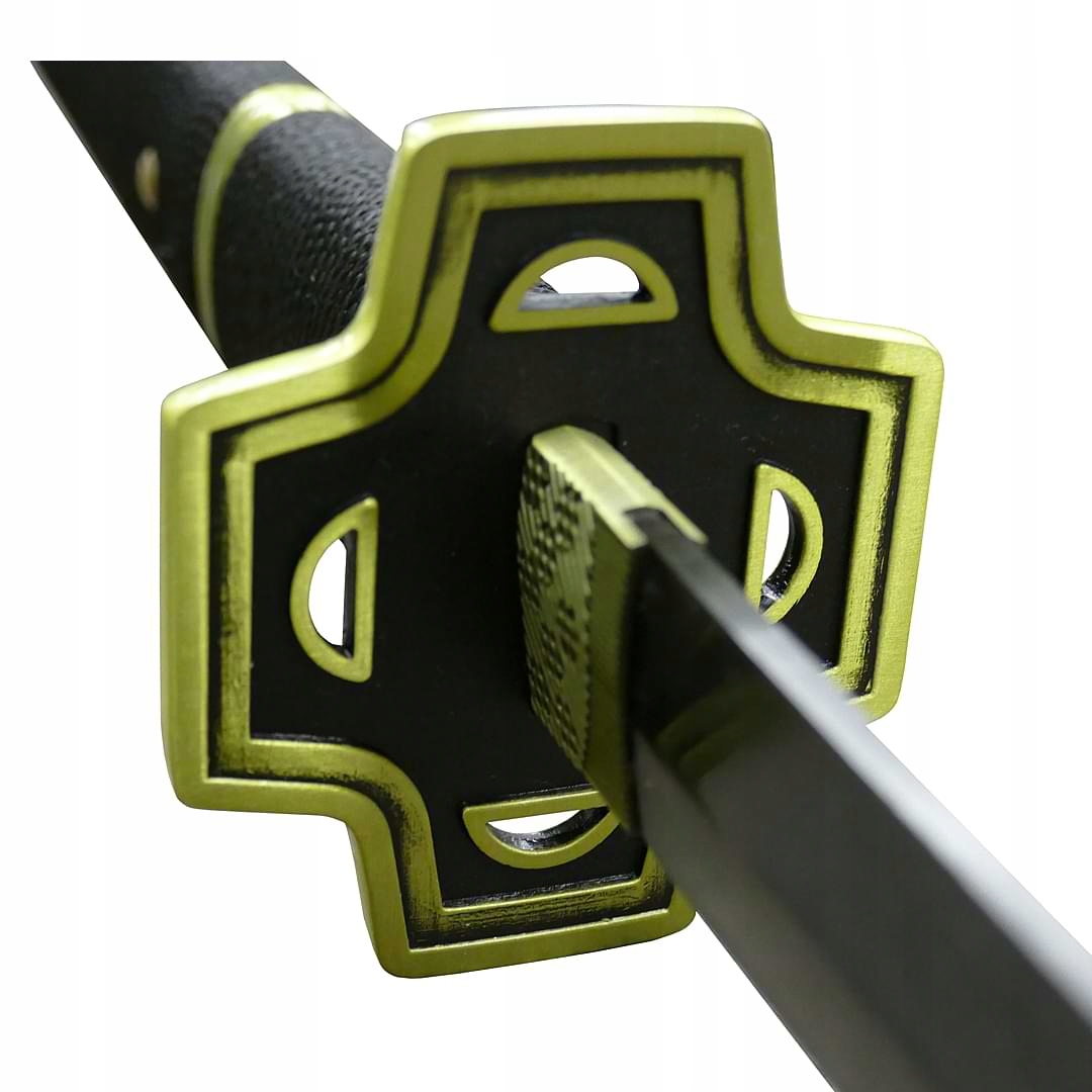 - Катана из металла и деревянных элементов. Лезвие из нержавеющей стали 440, половина лезвия окрашена, покрыта черной порошковой краской, тупая. Рукоять изготовлена из черной тесьмы с золотистой металлической вставкой. Катана поставляется в деревянных ножнах, покрытых черным лаком. Декоративные вставки золотого цвета. Дополнительно декоративная цуба черного и золотого цвета.