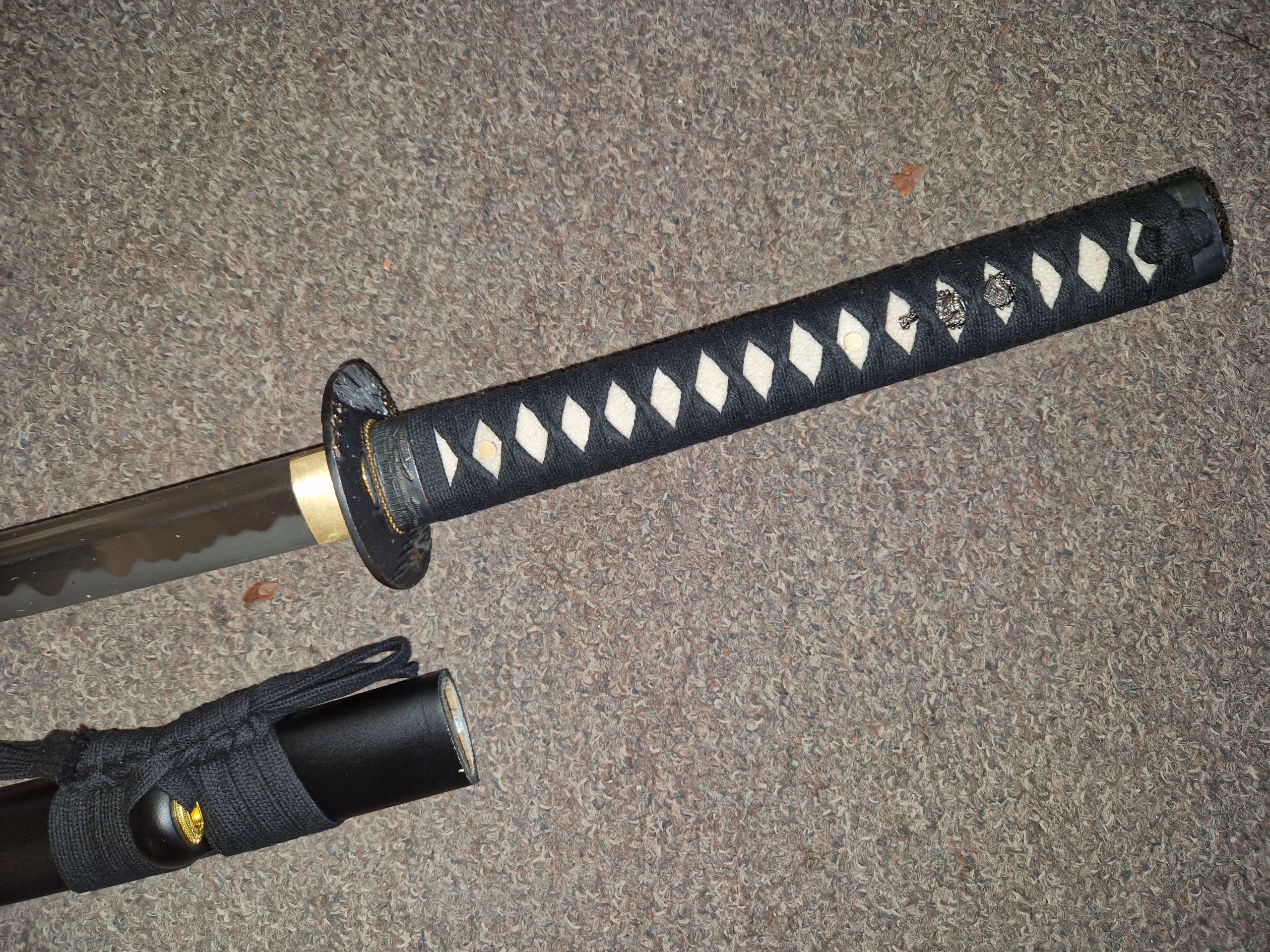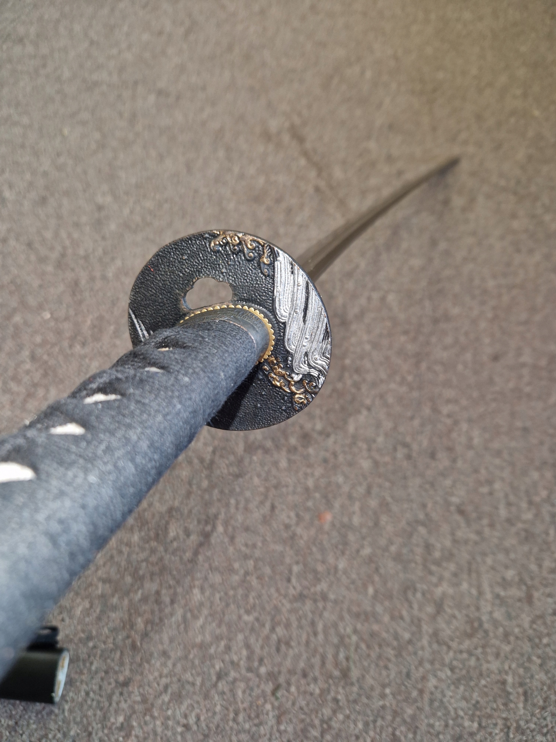, адаптированная к двум бою с Катаной, часто использовалась гонщиками в одной руке. С 15 -го века были популярны мечи, называемые Учигатаной, с щитом JELC (Tsuba), очень похожие на современные катаны, стали любимым оружием самураев в то время. Традиционный японский путь. Tsuba - круглый щит Jelec имеет задачу защитить руку и соответственно уравновесить меч. Он изготовлен из смесь цветных металлов. Воротник хабаки в верхней части лезвия изготовлен из драгоценных металлов. ТЕХНИЧЕСКИЕ ДАННЫ (Tsuka): 27 см/10,6 дюйма