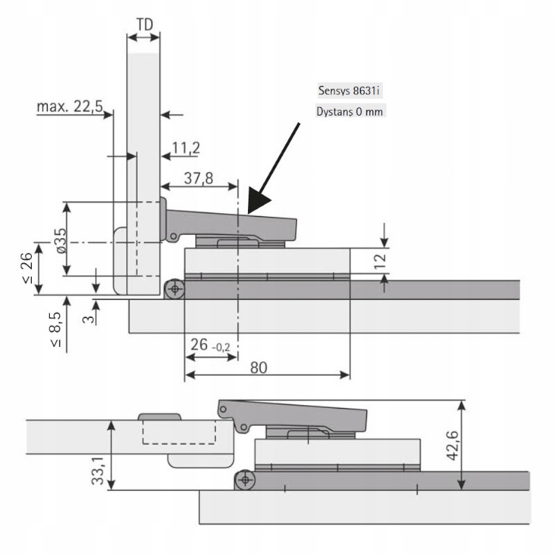 - Используя фронтальные полосы толщиной 12 мм: - шарнир sensys 8631i (9091400) и направляющий sensis d = 0 (9071575)