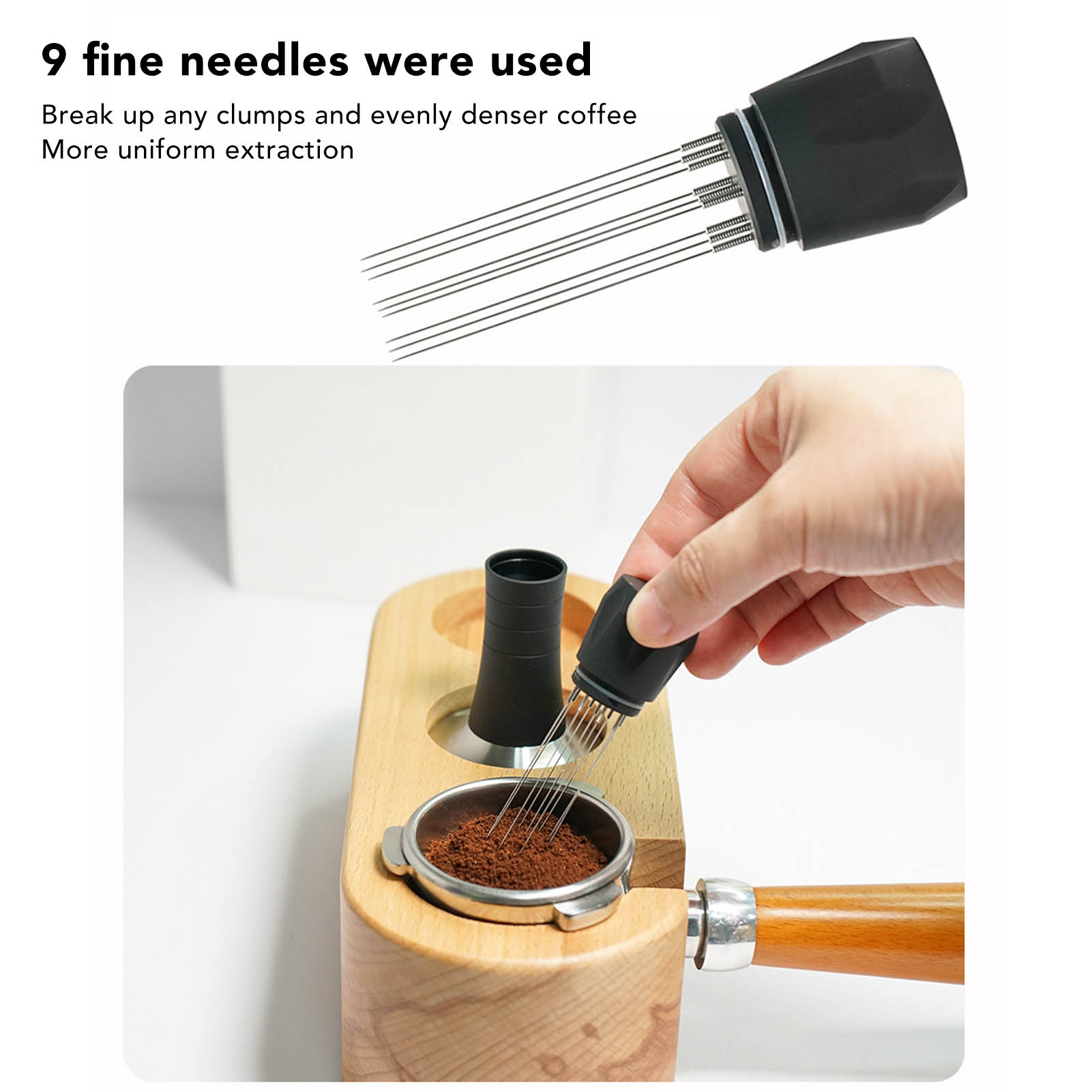 1. Многофункциональная конструкция: этот порошок связывает функции иглы для порошка и нажатия нажатия, чтобы закончить порошок и утолщение кофе в порошке. Благодаря этому кофеварке нужен только один инструмент, чтобы легко приготовить молотый кофе, устраняя необходимость залить молотый кофе в молотую иглу, а порошок шлифований
