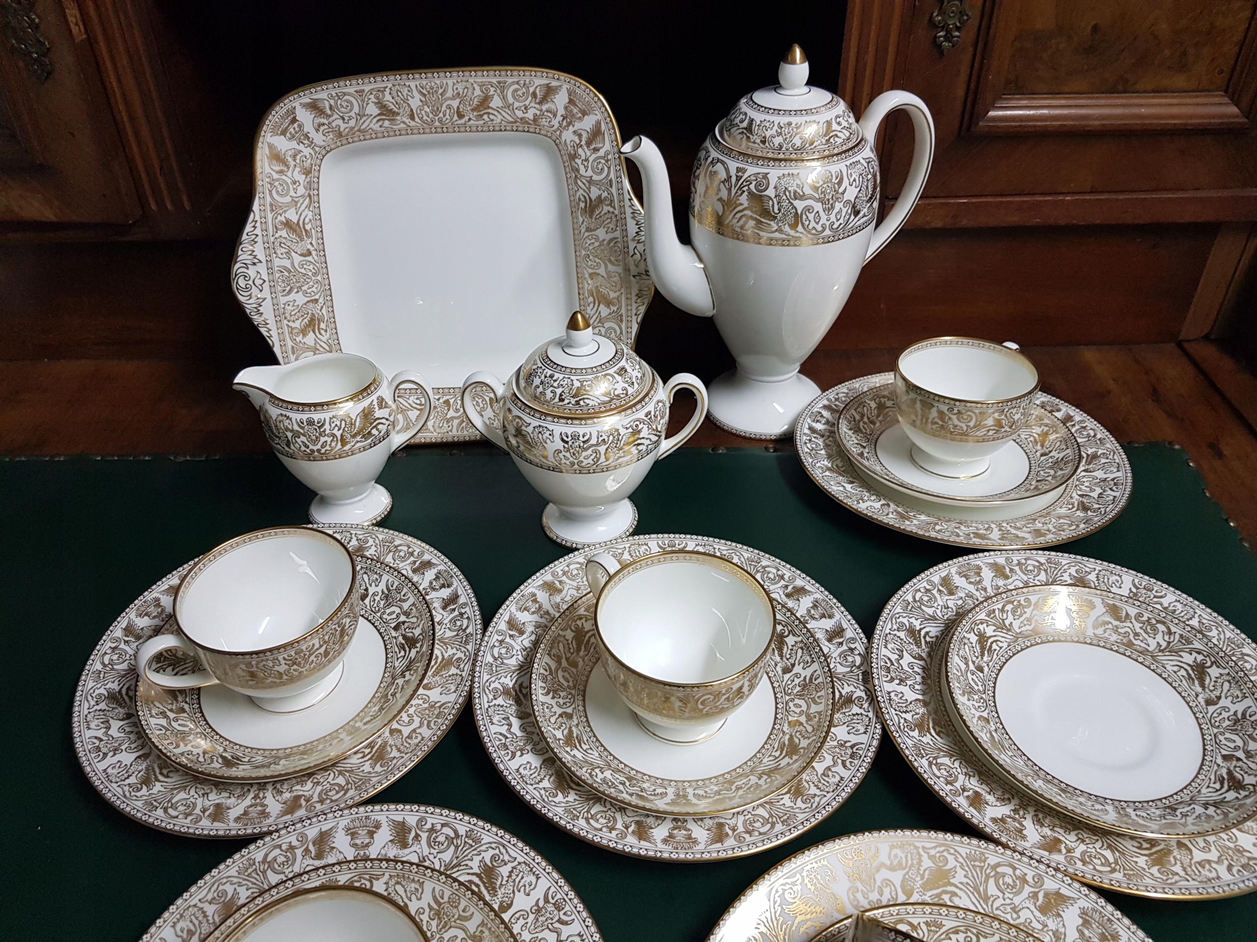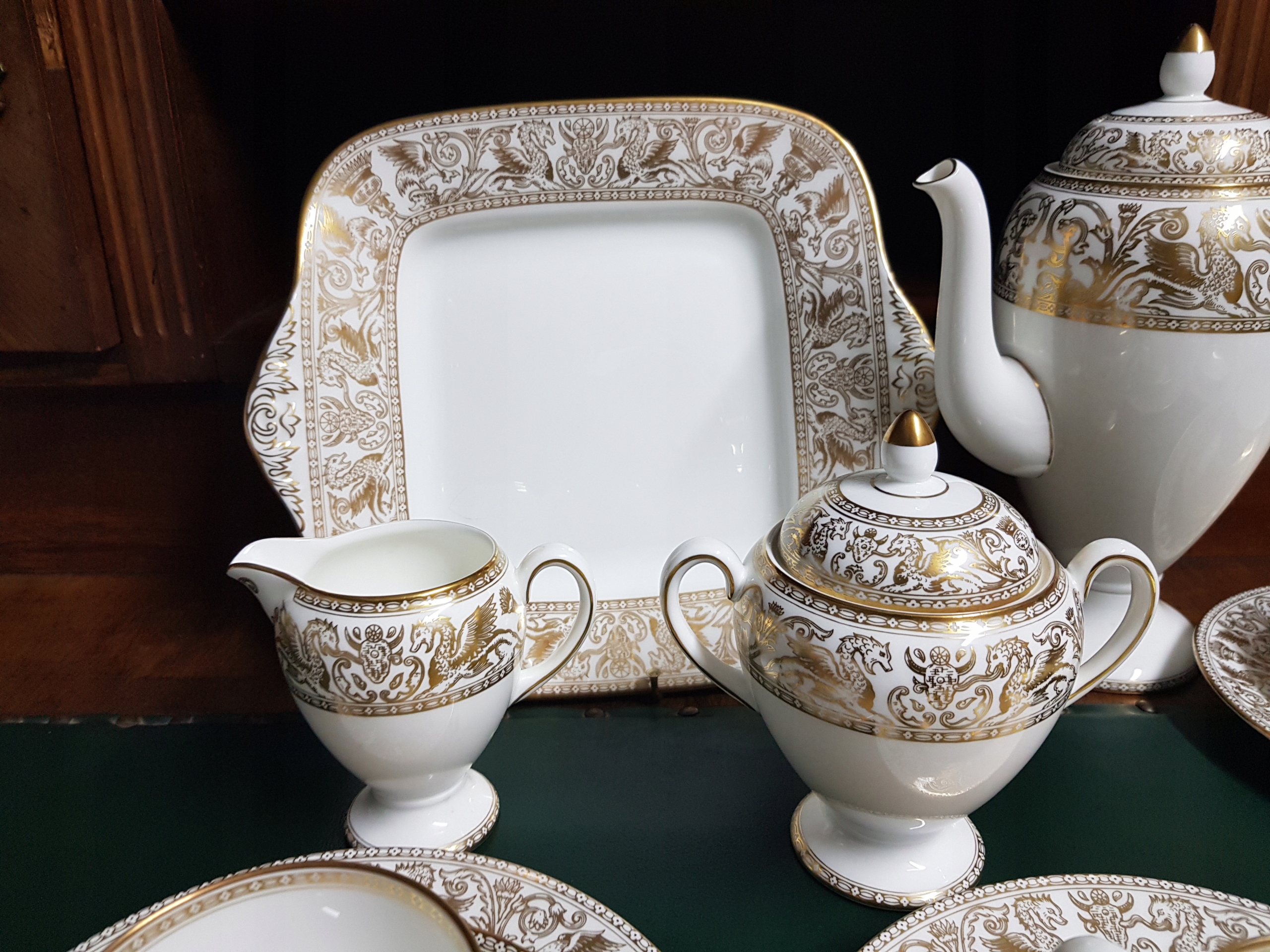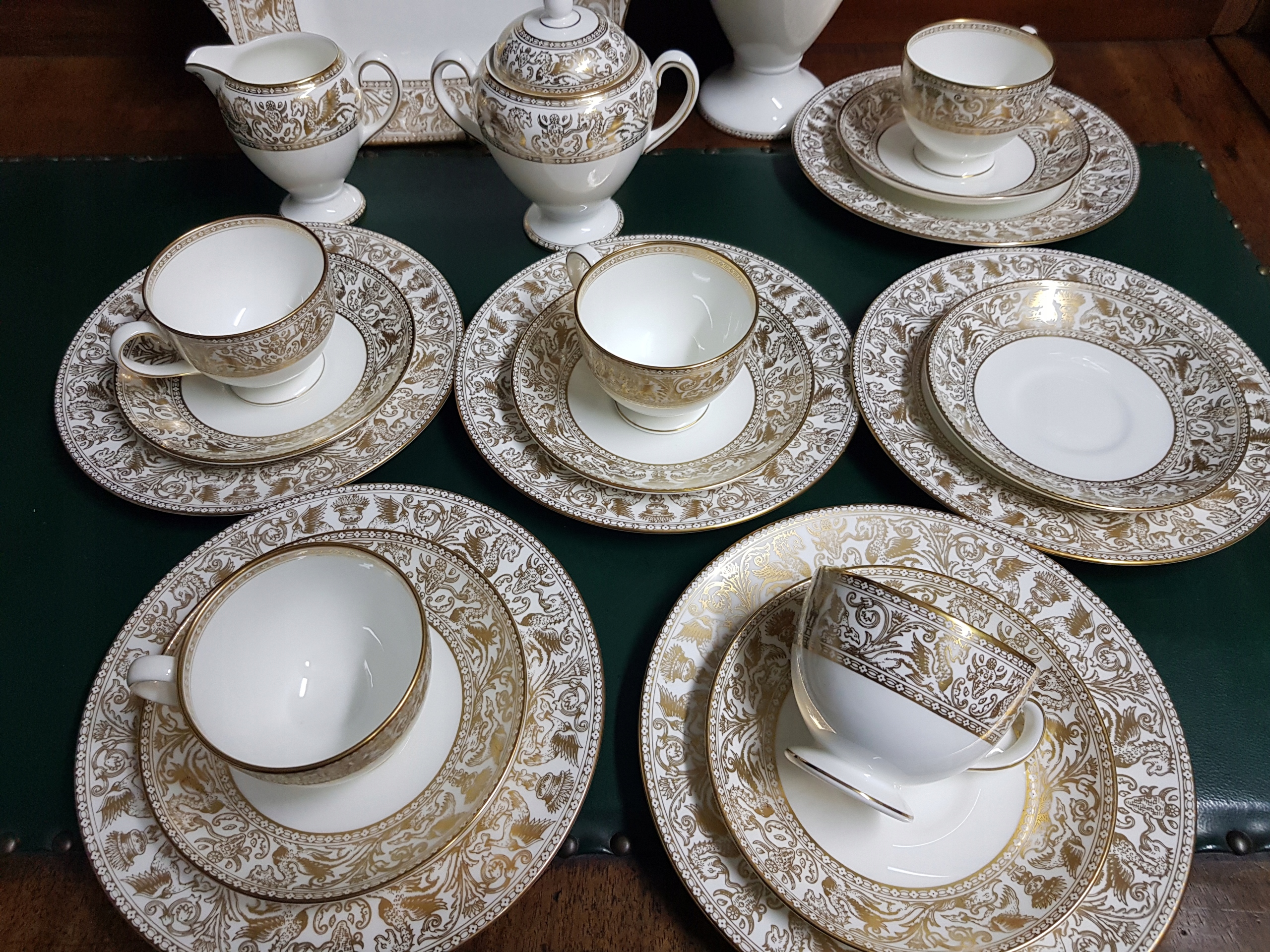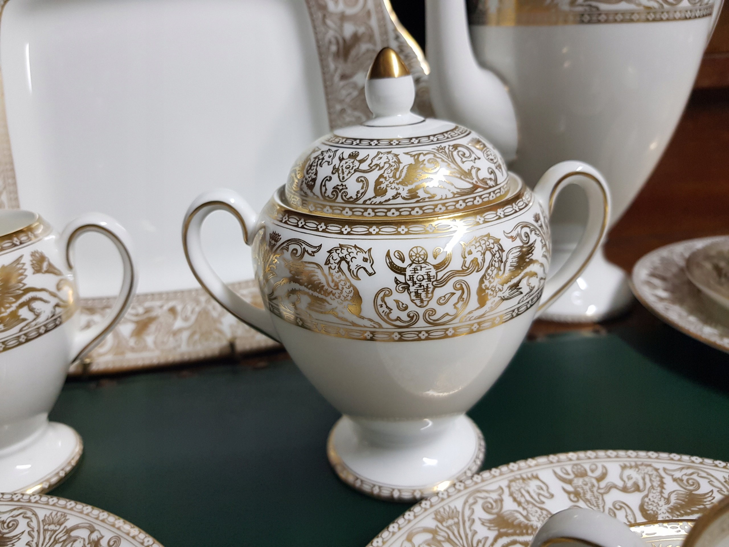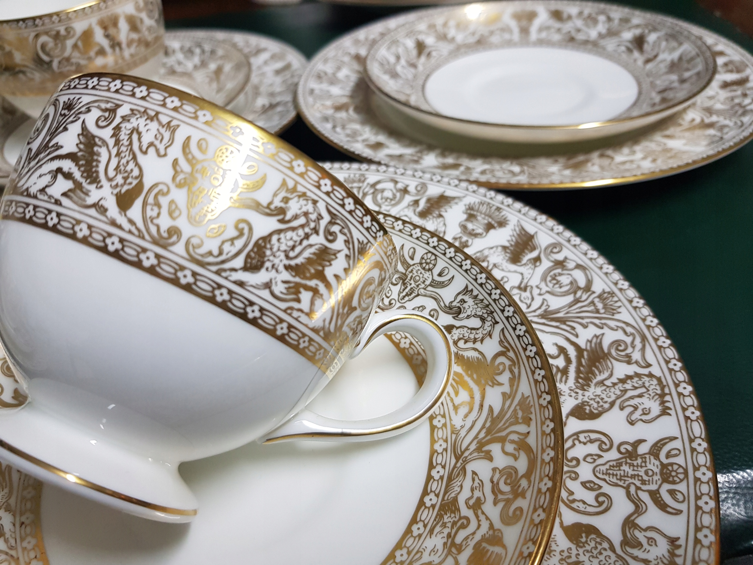 Предметом аукциона является набор на 5 персон от Wedgwood, Золотой флорентийский узор. В комплект входят 6 десертных тарелок, 6 блюдец, 5 чашек, 1 кувшин, 1 сахарница, 1 сливочник, 1 подставка для торта. .