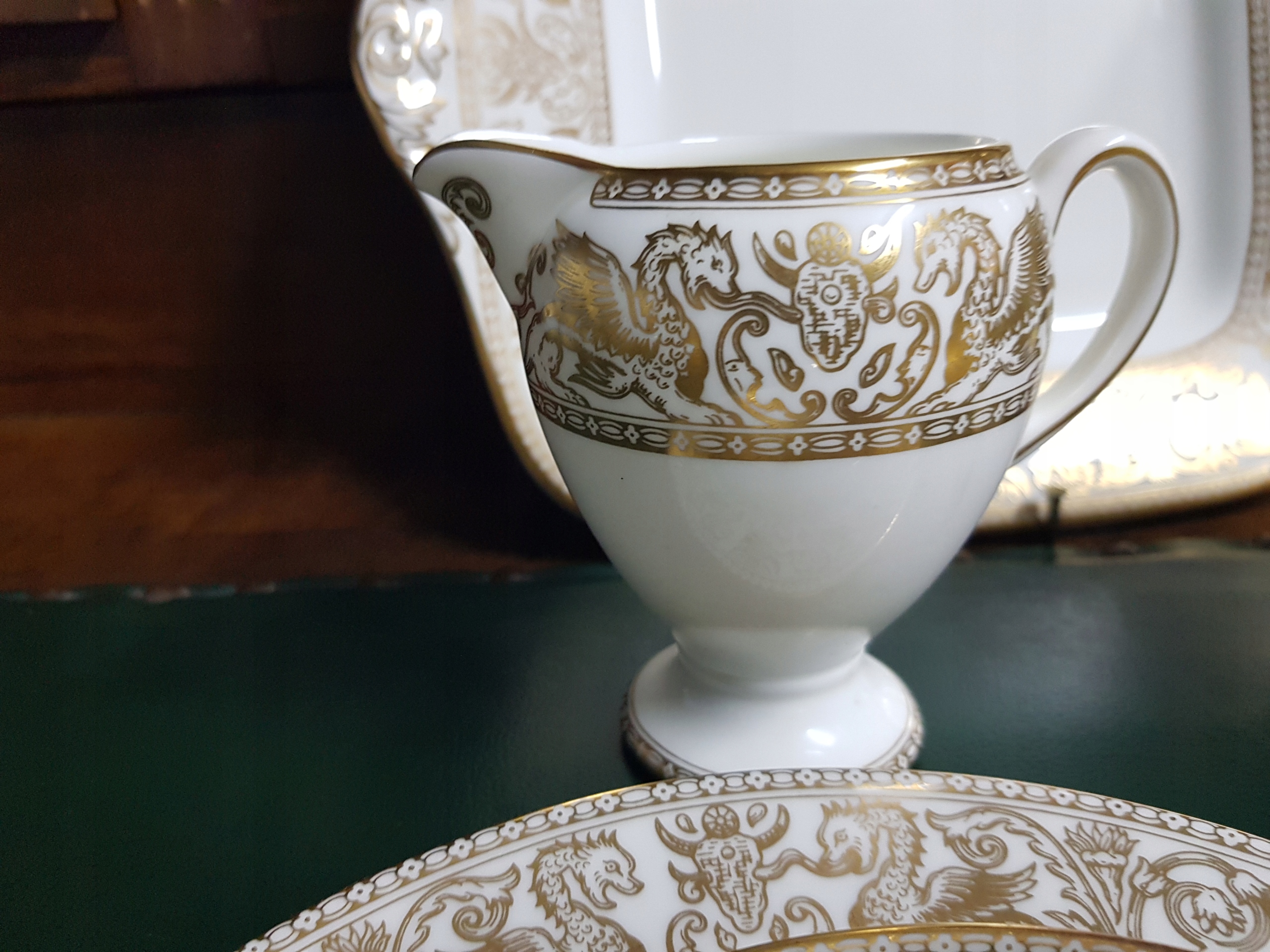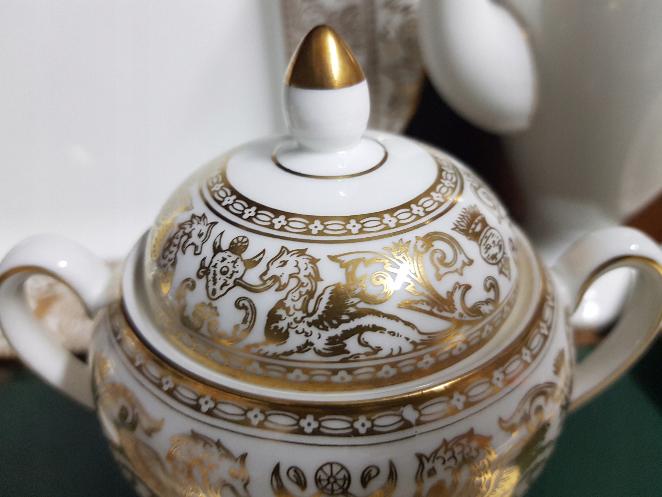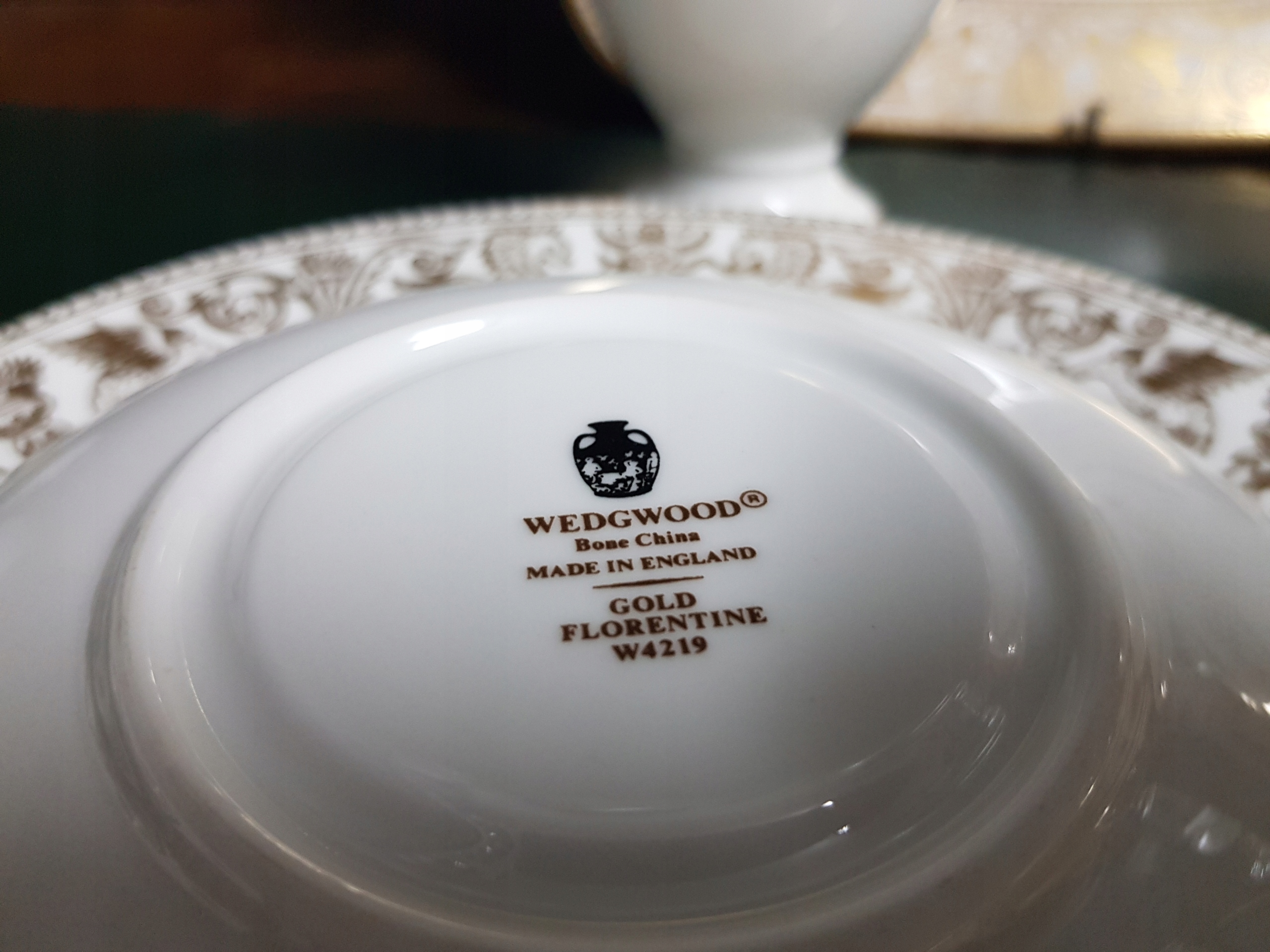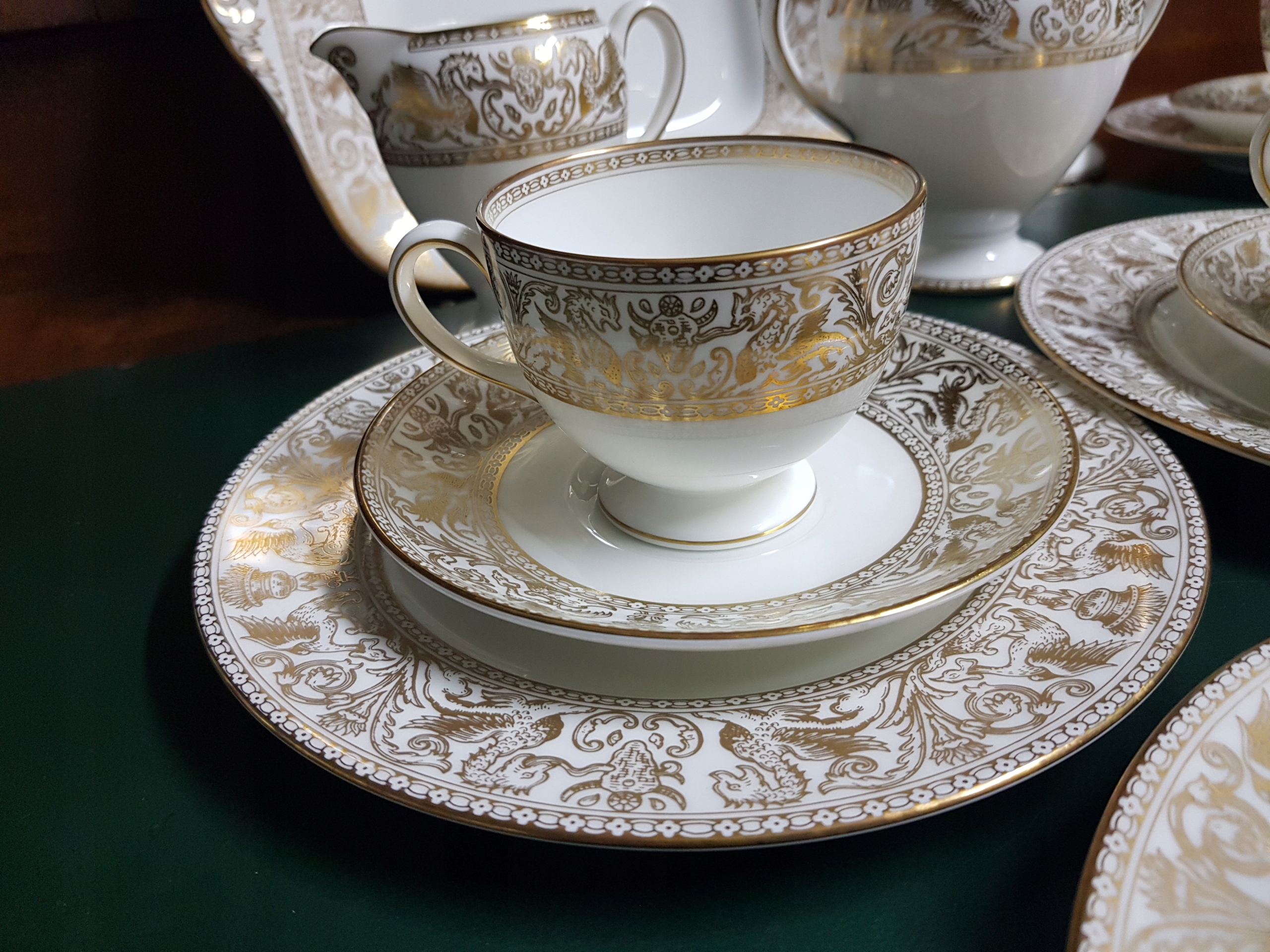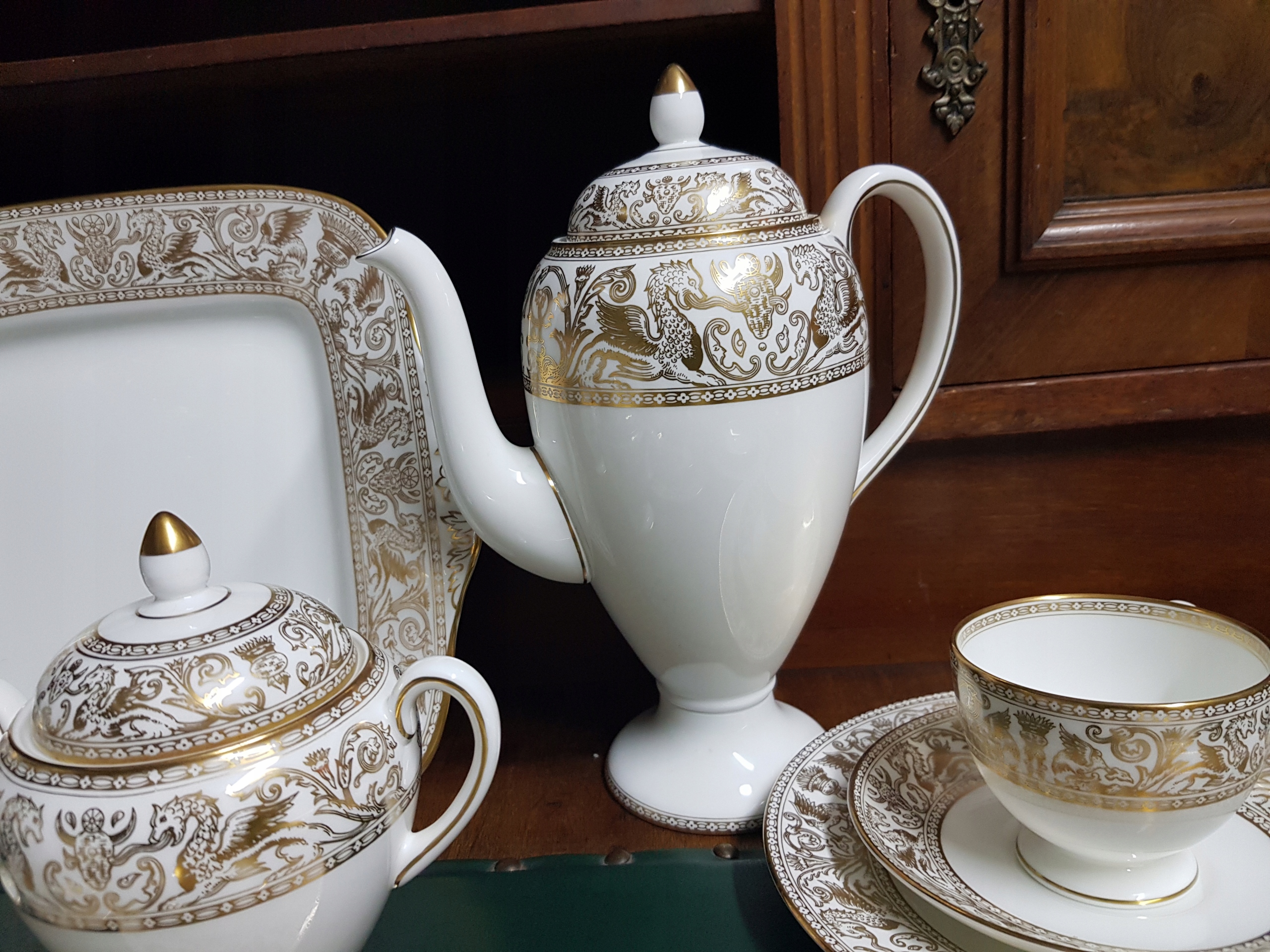 Предметом аукциона является набор на 5 персон от Wedgwood, Золотой флорентийский узор. В комплект входят 6 десертных тарелок, 6 блюдец, 5 чашек, 1 кувшин, 1 сахарница, 1 сливочник, 1 подставка для торта. .