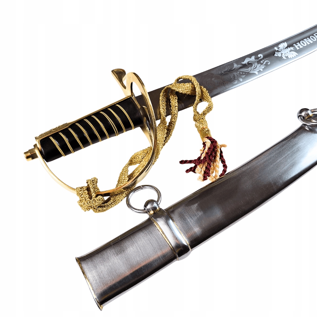 Сабля имеет деревянную рукоять, обтянутую кожей, обеспечивающую надежный хват, и декоративную петлю, отделанную кисточкой. (он такой же, как на 2-м фото)Клинок изготовлен из высококачественной незакаленной стали с полуматовым покрытием, чисто коллекционно-декоративный.