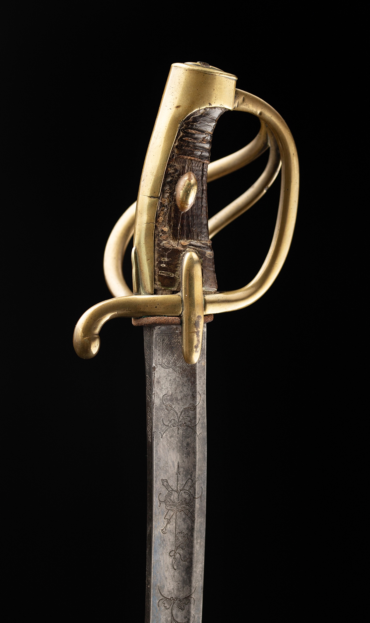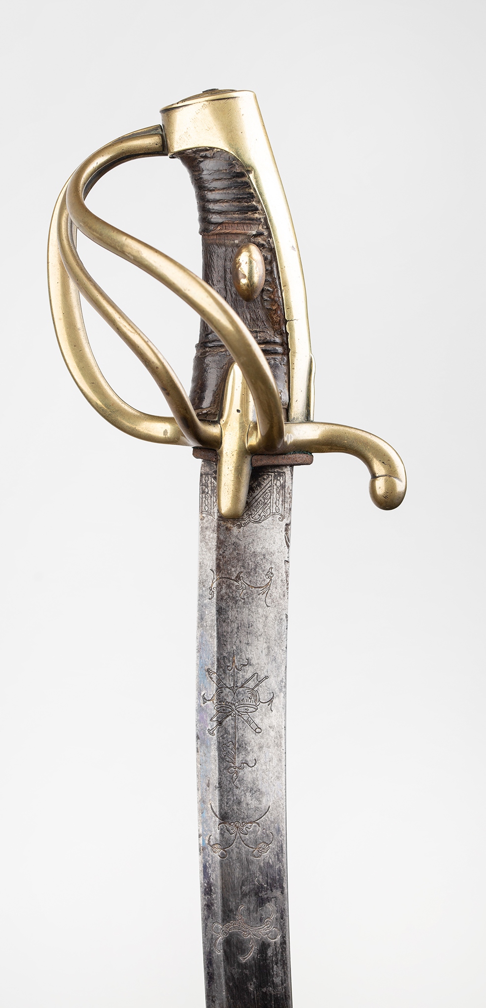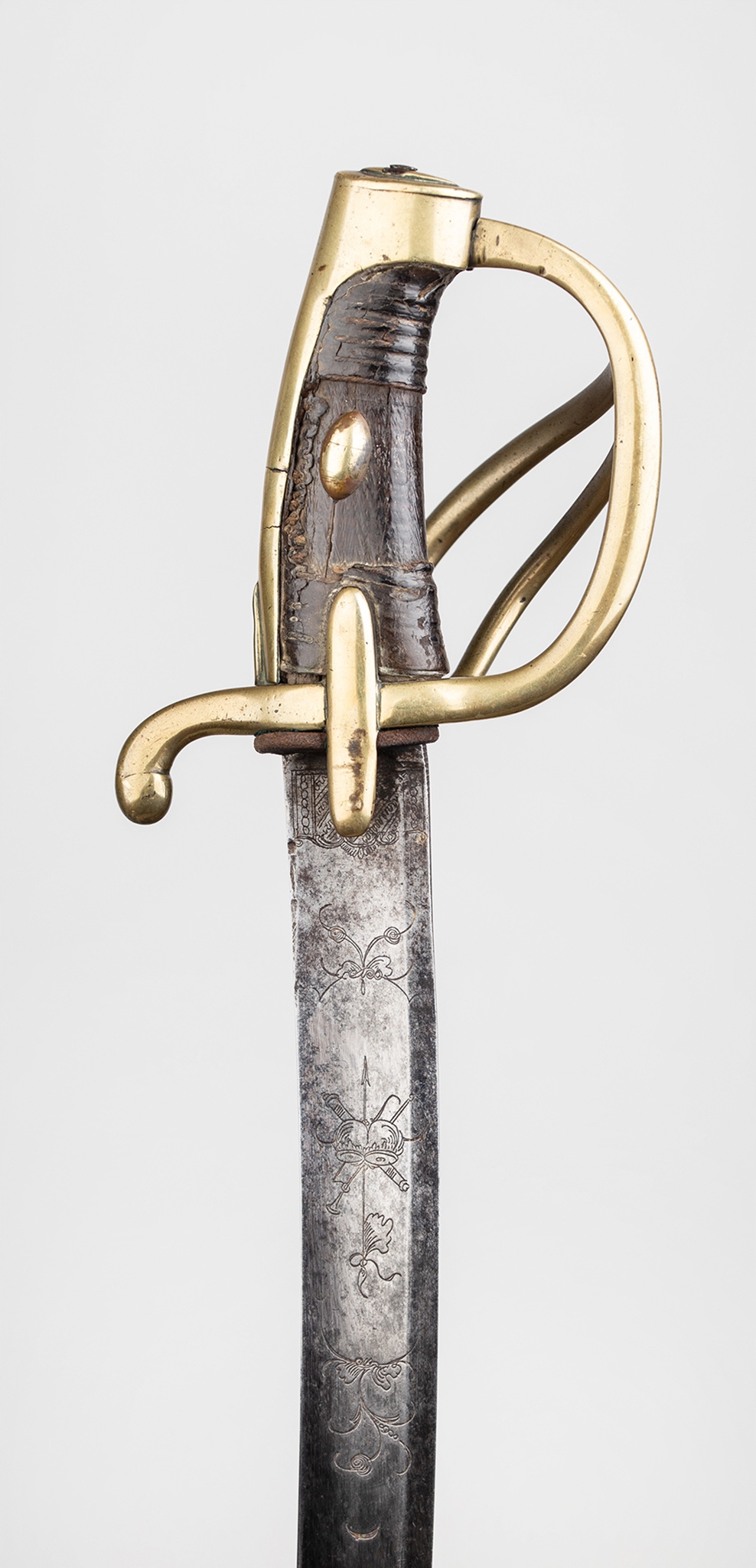 Французская сабля легкой кавалерийской модели и xi. Стальное лезвие с широкой двойной броней, украшенная окислением и ритм -украшением, датируемой длиной 1/4, ручка с двойным с двойным, отделанная нагретой гравировкой. На задней части лезвия застряльная надпись: «: Hoppe fabr a solingen ». Тройной jelec с двумя боковыми бактами. Передняя рука шаткой сгнутой, задняя рука согнулась вниз, закончена с выдающейся слезой. Голова слегка наклонилась вперед, покрытая капюшоном с головой, в которой кормят лезвие. Вал ручки деревянного, зарезанного, первоначально покрытый черной кожей. Шаровые овальные опухоли прикреплены к обеим сторонам ручки. Стальное влагалище, с двумя канавками и подвижными колесами нагрузки, отделанными с более длинным передним плечом.
