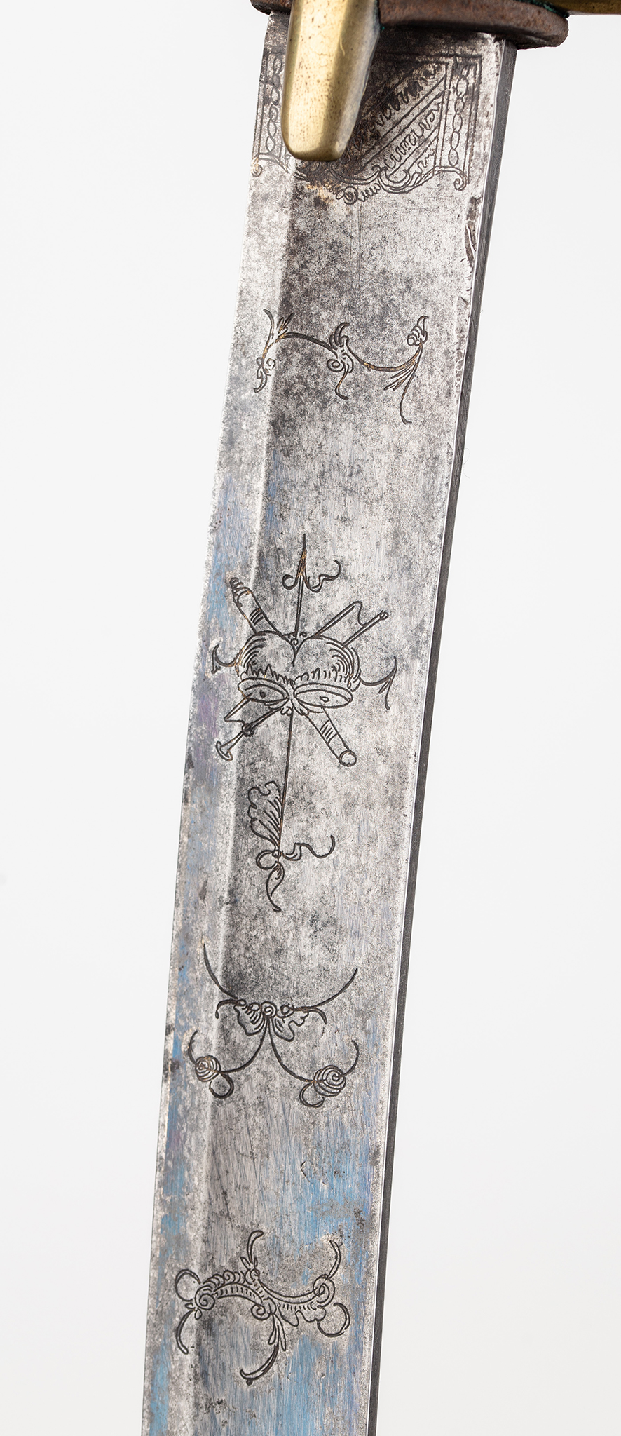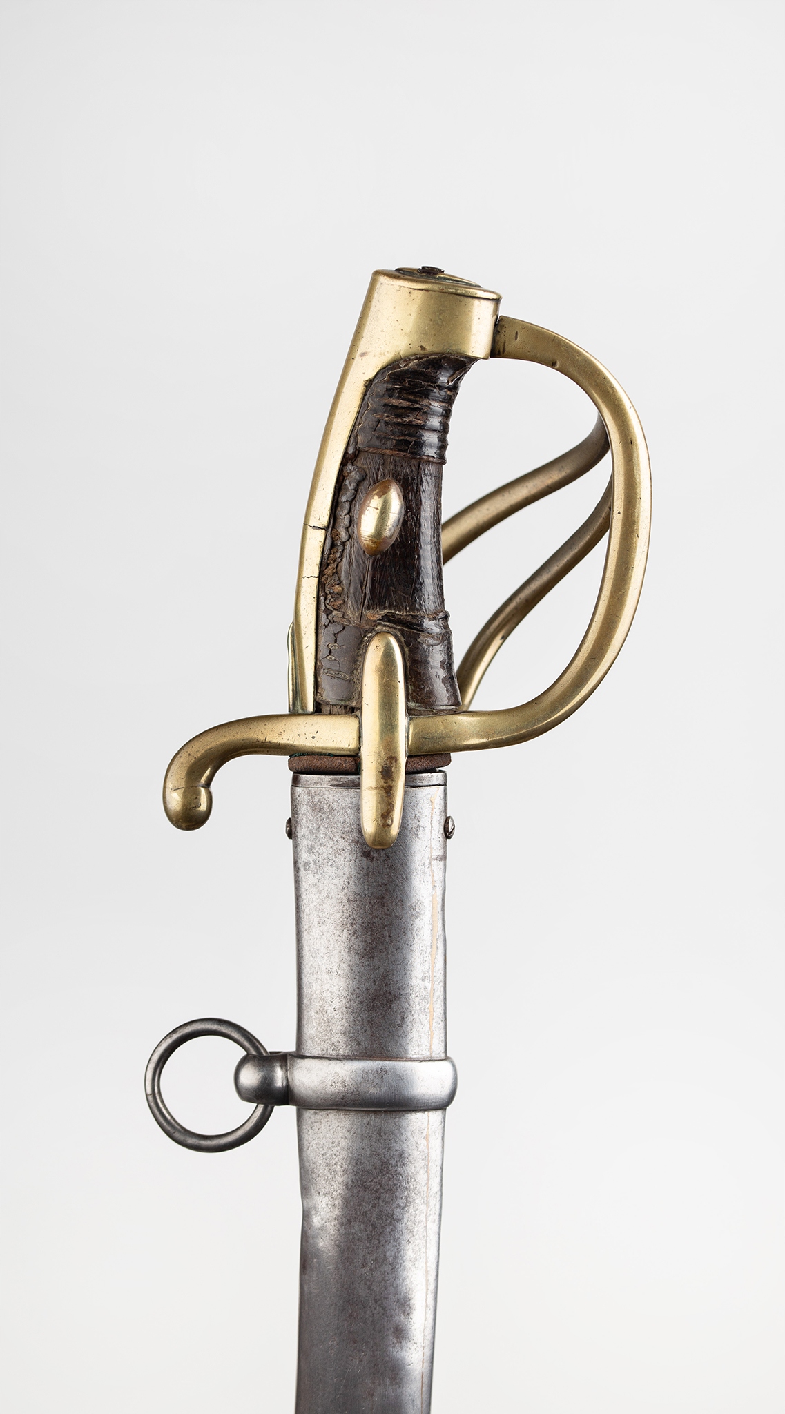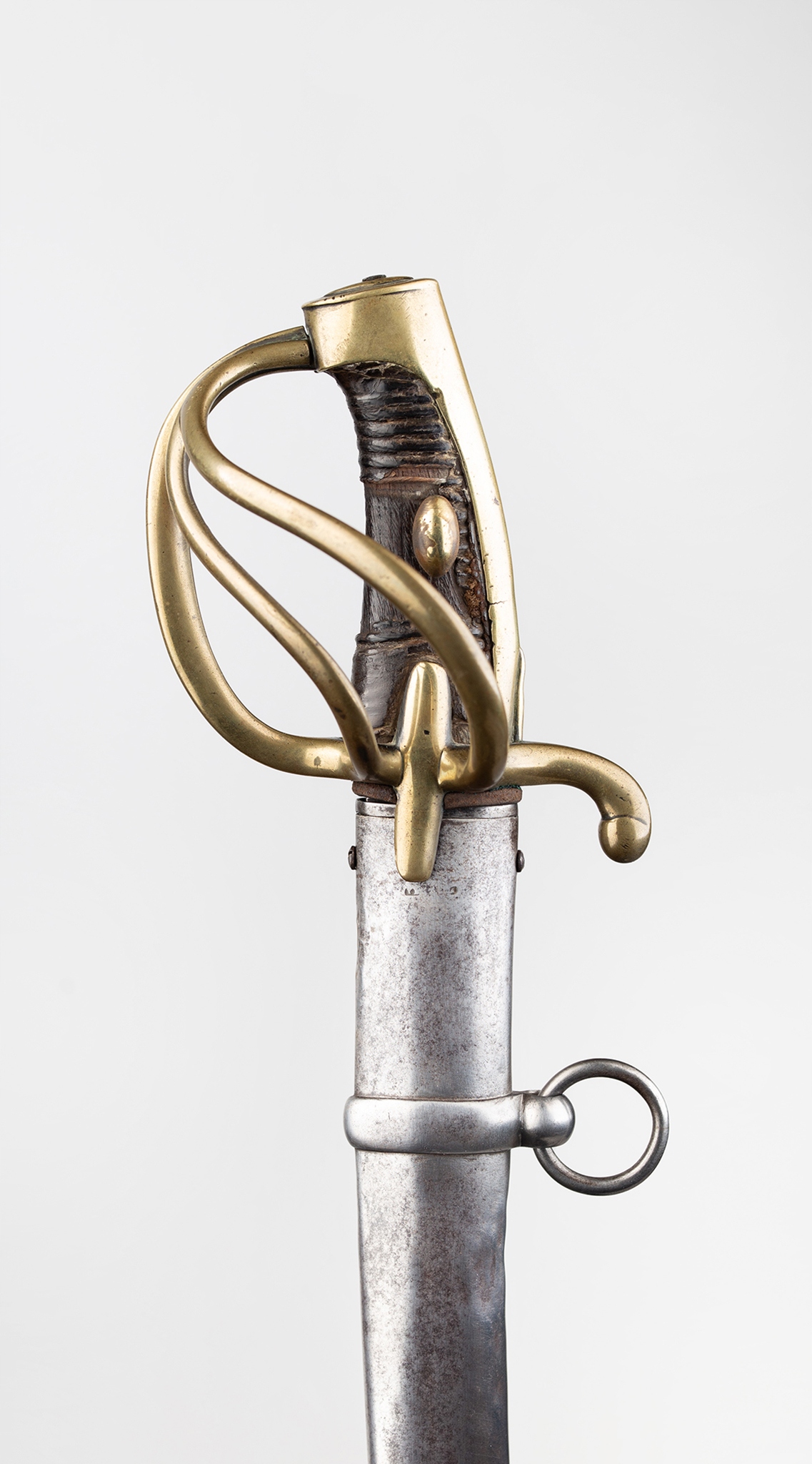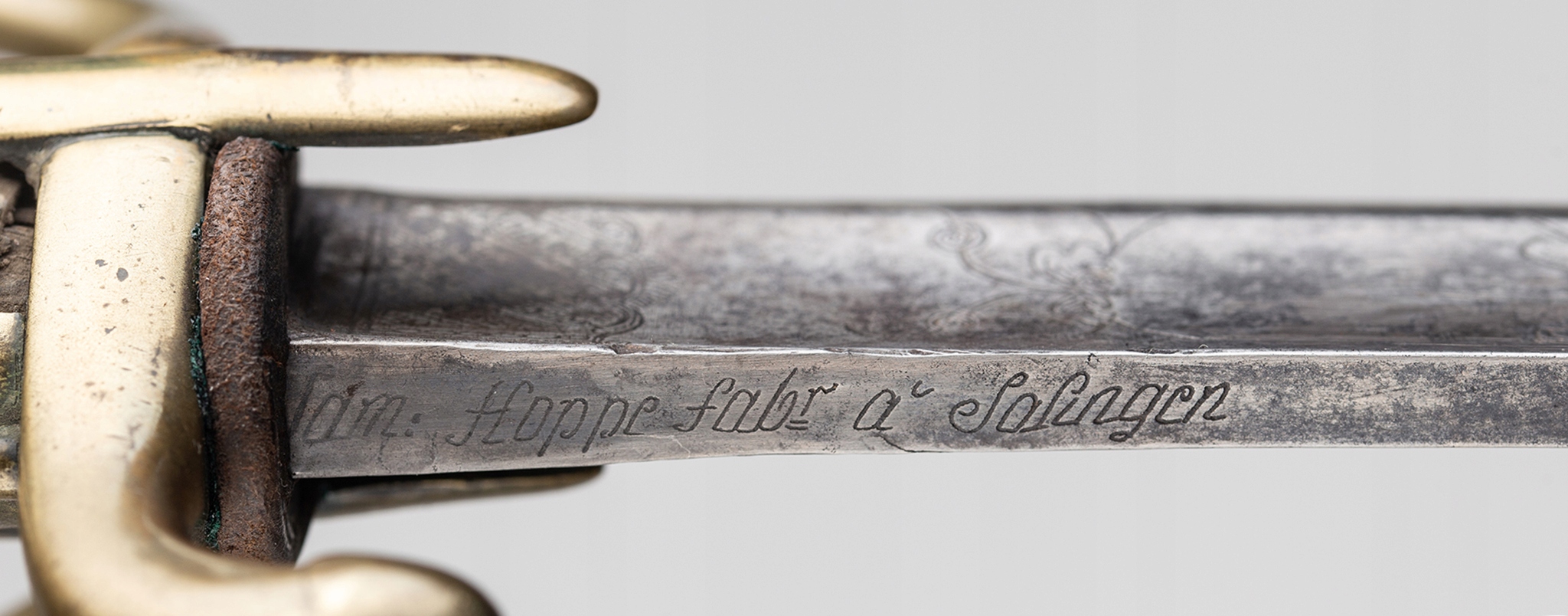 Французская сабля легкой кавалерийской модели и xi. Стальное лезвие с широкой двойной броней, украшенная окислением и ритм -украшением, датируемой длиной 1/4, ручка с двойным с двойным, отделанная нагретой гравировкой. На задней части лезвия застряльная надпись: «: Hoppe fabr a solingen ». Тройной jelec с двумя боковыми бактами. Передняя рука шаткой сгнутой, задняя рука согнулась вниз, закончена с выдающейся слезой. Голова слегка наклонилась вперед, покрытая капюшоном с головой, в которой кормят лезвие. Вал ручки деревянного, зарезанного, первоначально покрытый черной кожей. Шаровые овальные опухоли прикреплены к обеим сторонам ручки. Стальное влагалище, с двумя канавками и подвижными колесами нагрузки, отделанными с более длинным передним плечом.