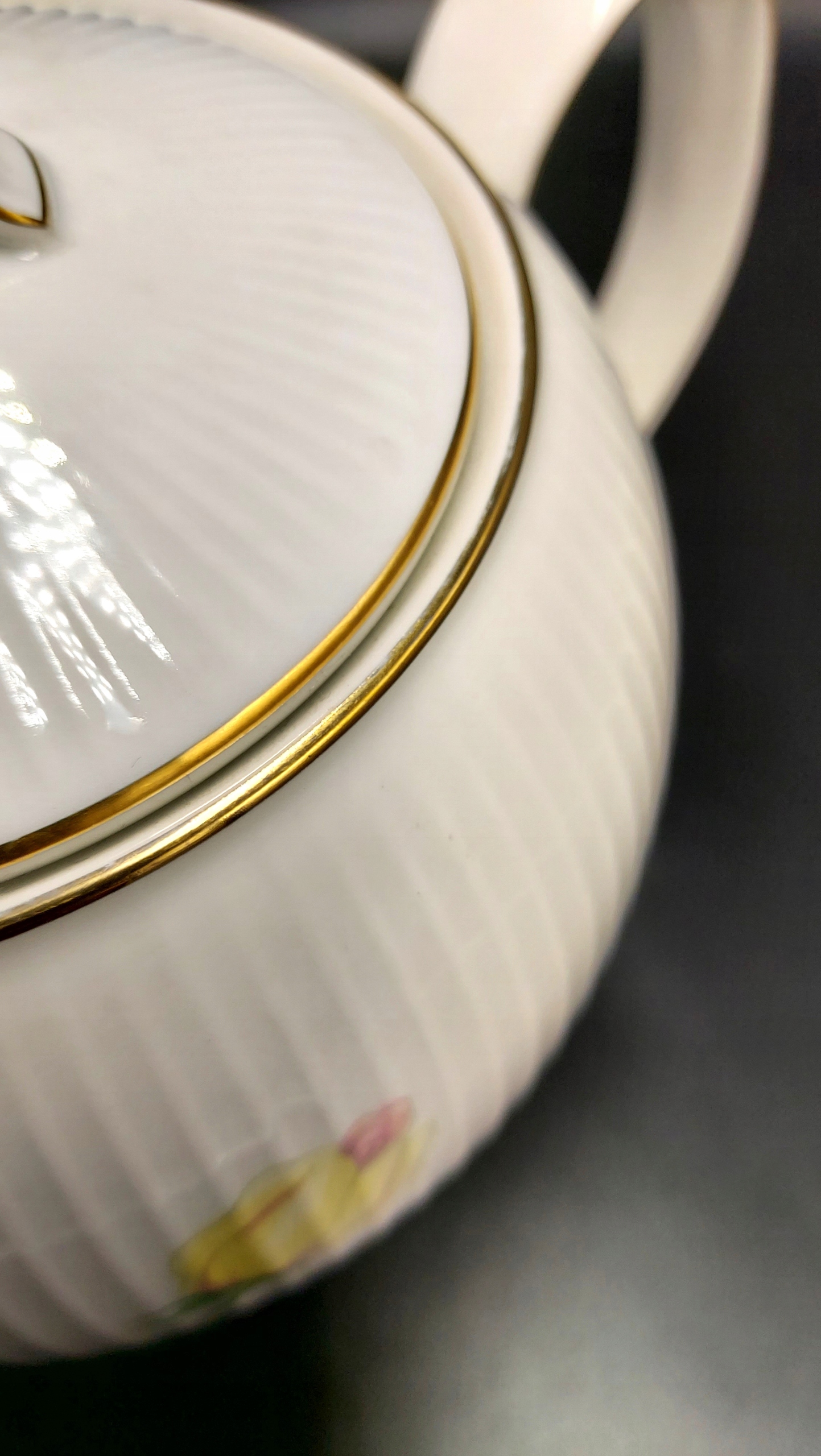 Кувшин изготовлен из фарфора высочайшего качества цвета слоновой кости и имеет большой размер. Округлый ребристый живот украшен нежным цветочным мотивом. Большая ручка позволяет комфортно пользоваться кувшином. Он украшен тонкой золотой позолотой по всем краям. Все выглядит очень со вкусом. Подпись внизу знаком THOMAS, использовавшимся в 1959–1977 годах.