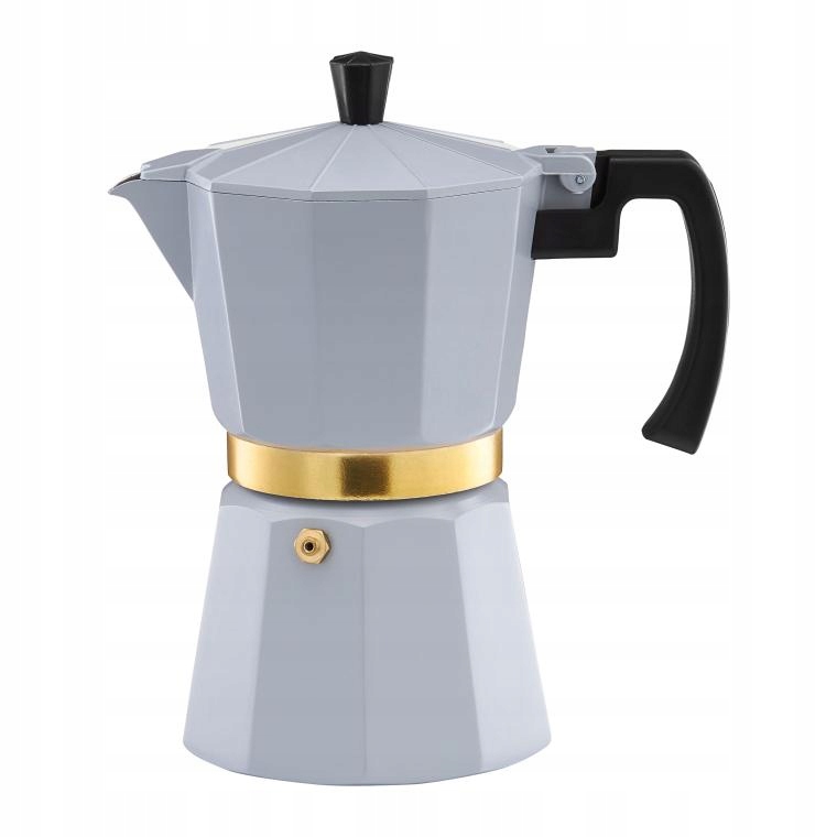 Традиционная угловатая форма позволяет приготовить шесть чашек эспрессо по 50 мл. Из-за давления, создаваемого в нижней емкости во время приготовления, кофе скапливается в верхней части. Имеет удобную ручку для удобного наливания. Его матовая серая отделка в сочетании с золотыми деталями восхищает и добавляет элегантности. Это прекрасное дополнение к коллекции Royal, в которую входят кружки, чашки и заварочные устройства с золотыми акцентами.