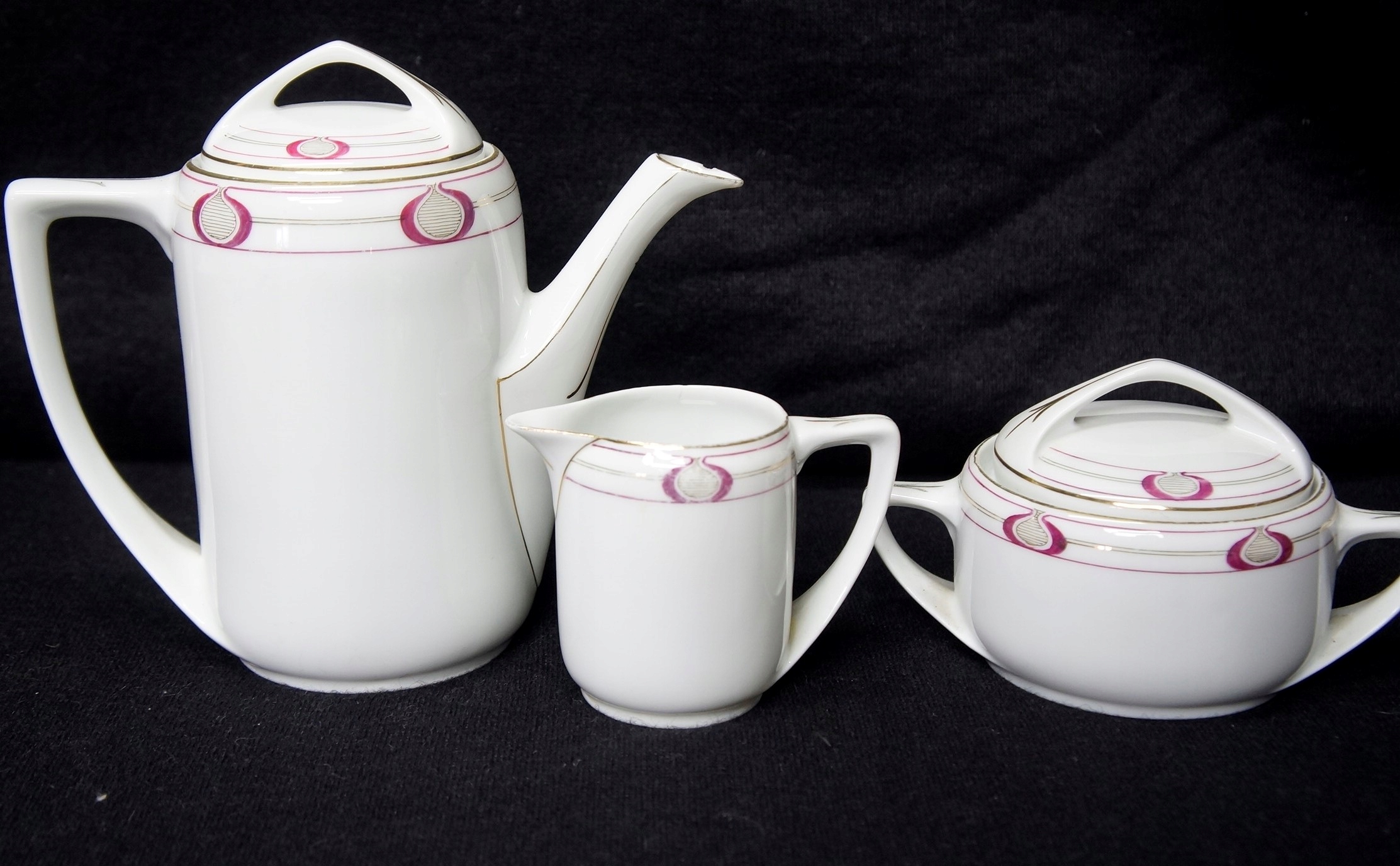 Фарфор белый, довольно нежный, кораллово-золотой узор на каждом элементе.