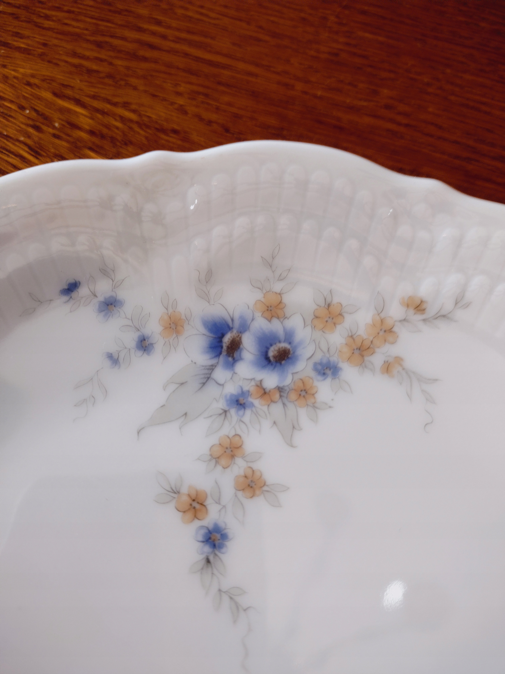 Сервиз рассчитан на четырех персон, имеет интересную форму, украшен нежными цветами.