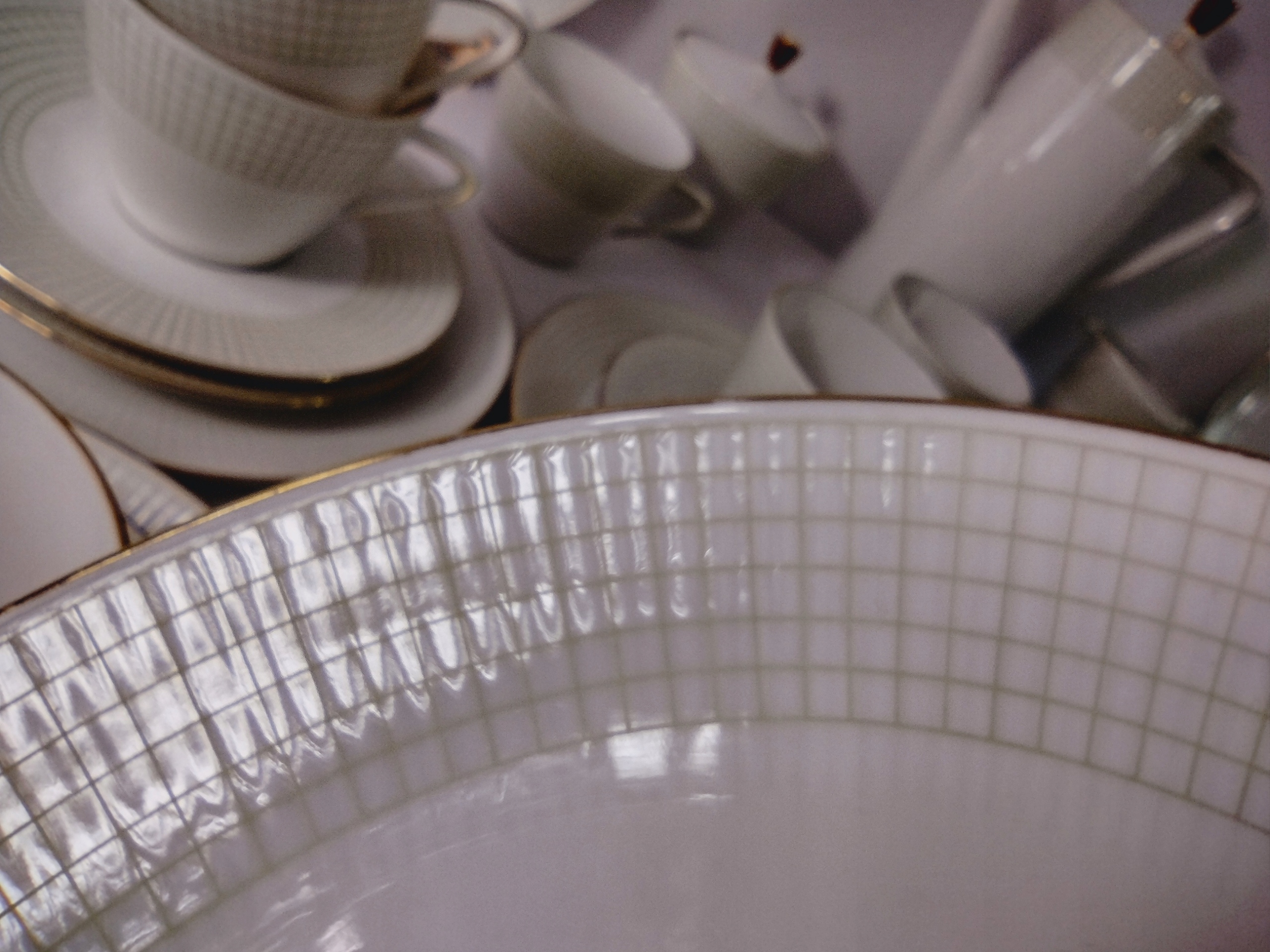 Тонкостенный фарфор с нежной зеленой клеткой и золотыми полосками.