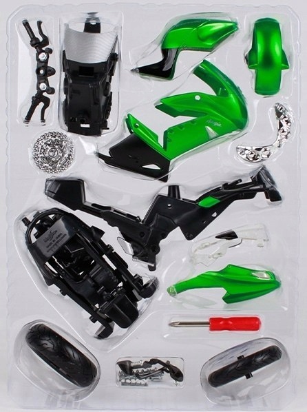 Модель мотоцикла Kawasaki характеризуется вниманием к деталям. Он имеет движущиеся элементы: нижний колонтитул, рулевое колесо, колеса, задний маятник