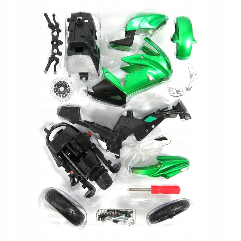 Модель мотоцикла для складывания по шкале 1:12. Комплект включает в себя около 20 элементов и аксессуаров, необходимых для складывания мотоцикла. Это не требует дополнительных инструментов.