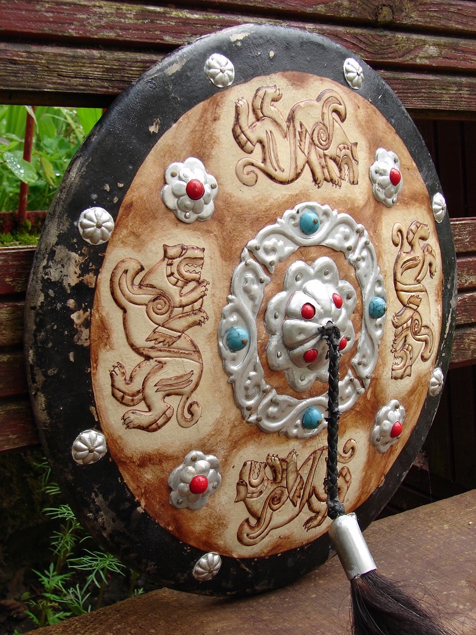 Реплика казахского щита, сделанная рукой кожаного металла и кошачьих щетинок.