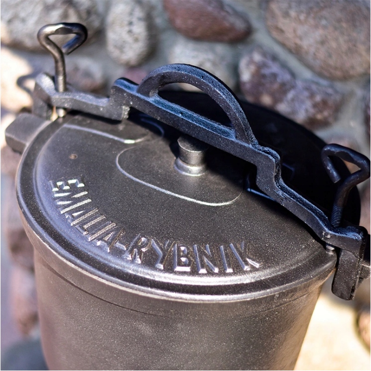 Казан оснащен прочной крышкой с отверстием, тремя устойчивыми ножками и привинчивающейся ручкой, которая плотно прижимает крышку. Толстое дно чугунного казана позволяет приготовленным блюдам медленно остывать. Чугун очень хорошо и равномерно проводит тепло.