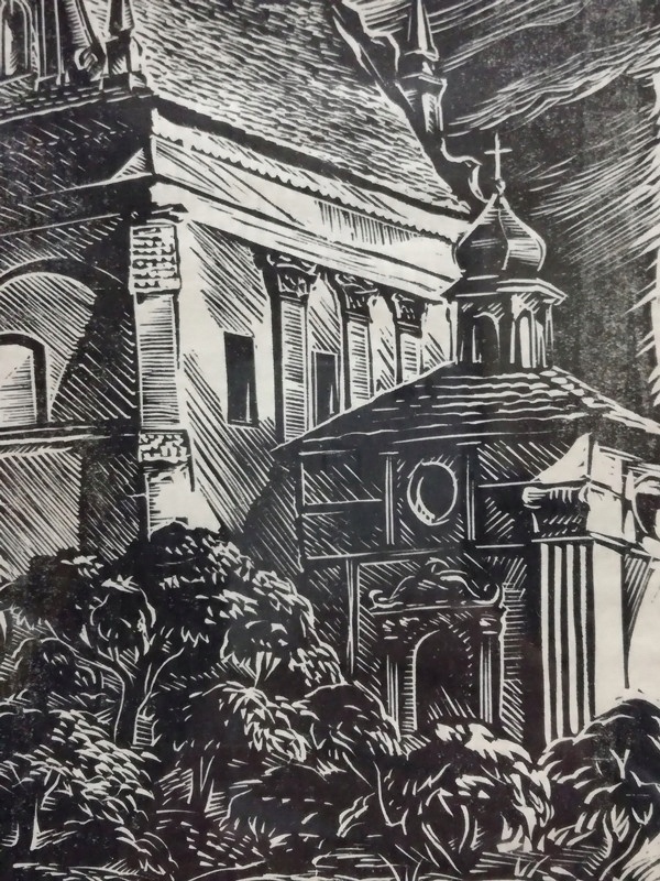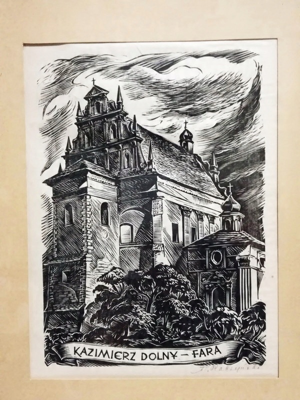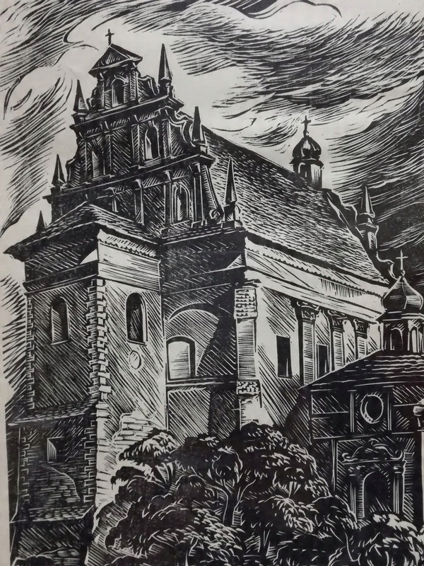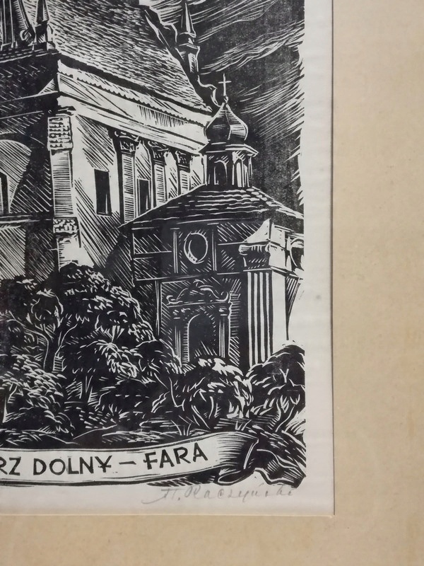 - название и автор КАЗИМИР ДОЛЬНЫЙ ФАРА Станислав РАЧИНСКИЙ ДЕРЕВО, Краков 1954, работа подписана карандашом под композицией: "Св. Рачинский"