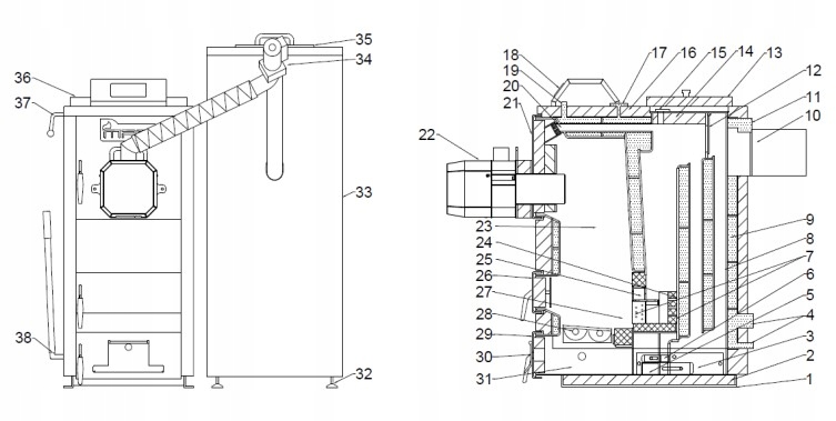 1. Котловые ноги 2. Теплоизоляция котла 3. Боковой очистка 4. Мафта обратной воды и сливного клапана 5. Нагрев и регулировка вторичного воздуха. № 1 6. Нагрев и регулировка вторичного питания воздуха и регулировки воды 12. Краткая дымовая цепь. Термометр 18. Драйвер 19. Mufa Muca Smone Changer 20. Отличный Cule (System) 21. Боковой погрузчик 22 24. Ceramic Whirling Gurner (камера сгорания) 25. перегородка со вторичным воздухом № 1 26.