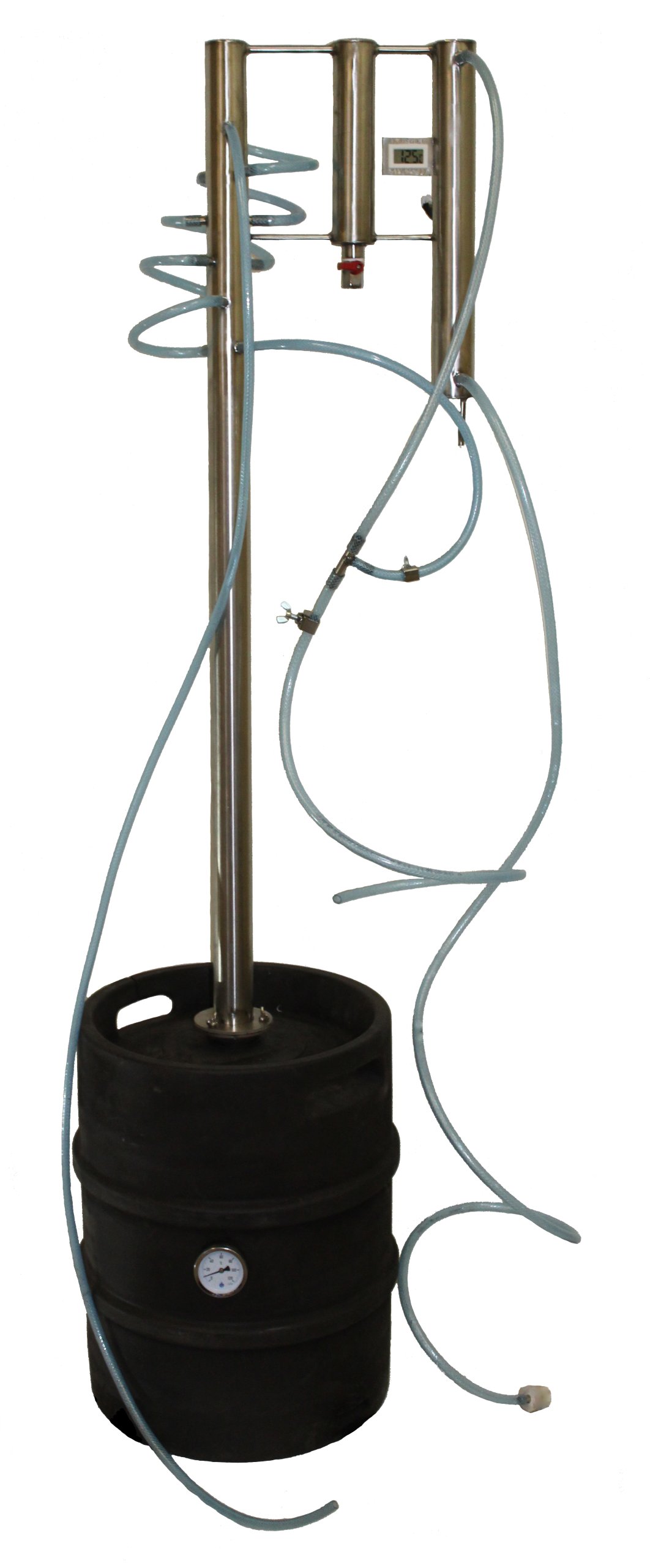 1.Кега емкостью 30 или 50 л изготовлена из нержавеющей стали с покрытием, снижающим потери тепла при перегонке. Кег имеет вваренную втулку 5/4" для электронагревателя, втулку 3/4" для сливного клапана и втулку 1/2" для термометра. Очень быстрая и простая сборка колонны с помощью барашковых гаек, не требует инструментов. Регенерированный ствол.