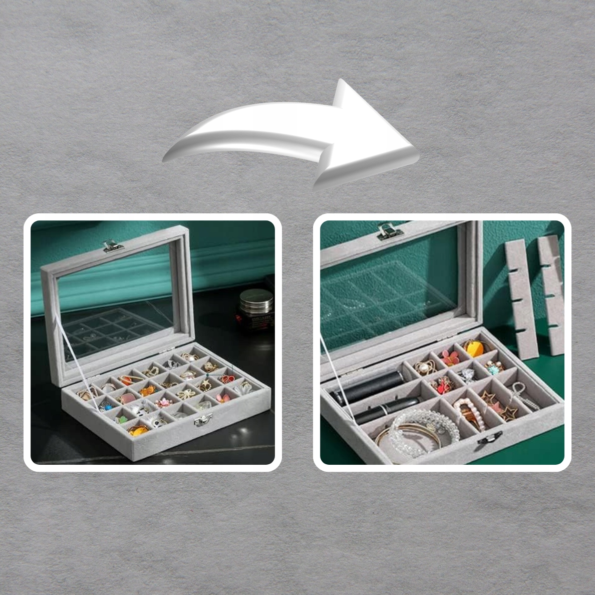 В коробке есть съемные отделения, которые позволяют настроить внутреннее пространство под индивидуальные нужды. Их можно переместить или полностью убрать, чтобы освободить больше места для более крупных украшений.