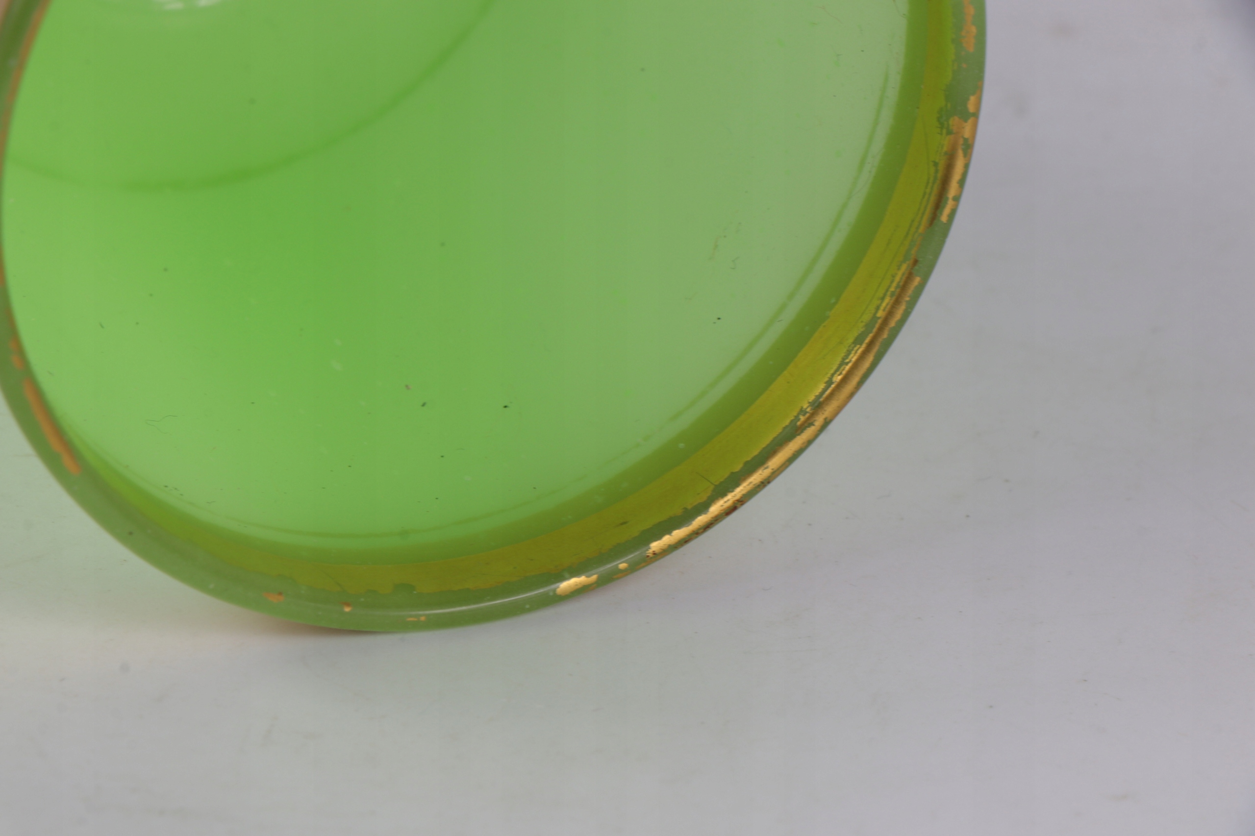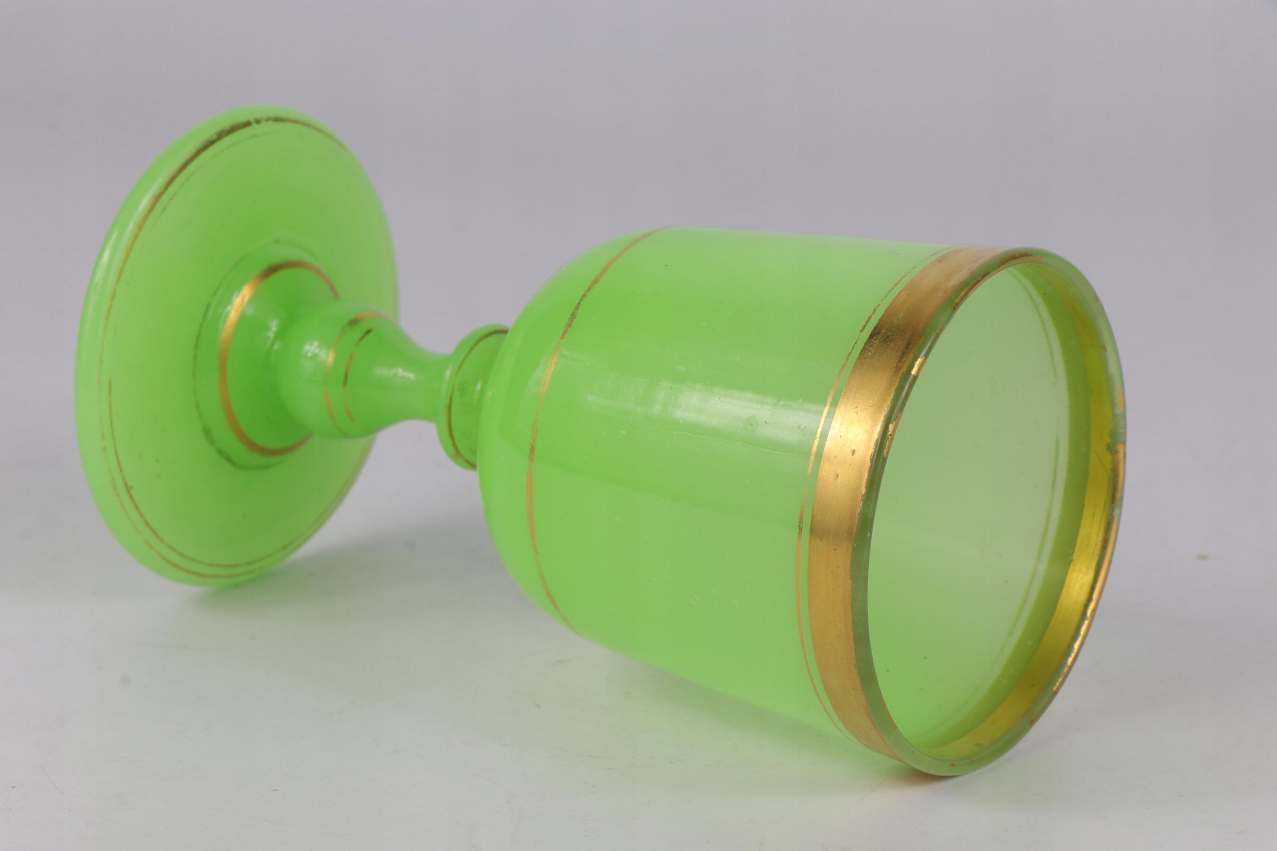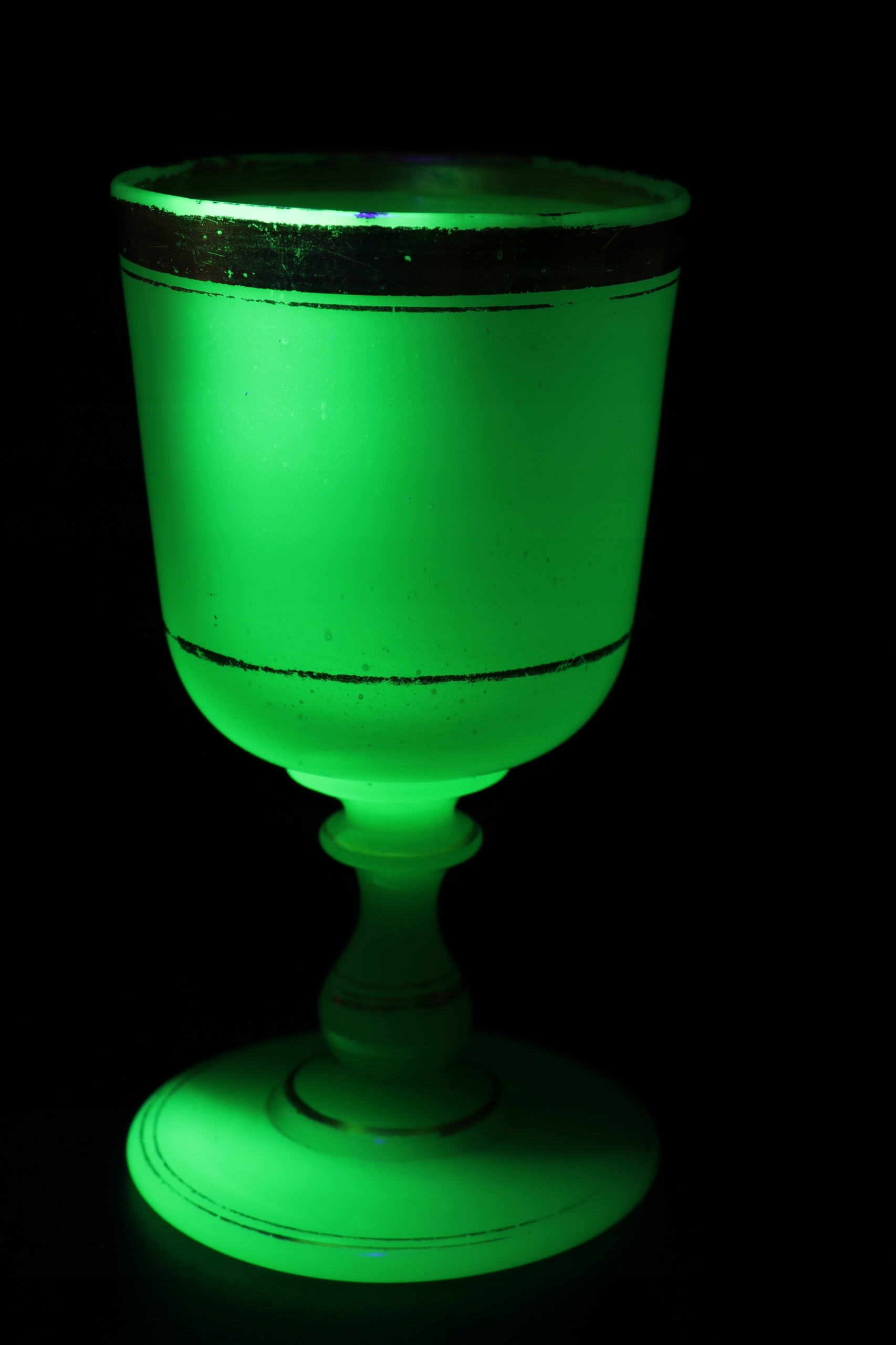Чашка стекла из уранового стекла в характерном зеленом цвете. Густое массивное стекло, украшенное золотым орнаментом. Стекло с четко отшлифованным объективом на дне. Вторые и последние фотографии в ультрафиолетовом свете. Возможно, чашка немного старше с конца девятнадцатого века.