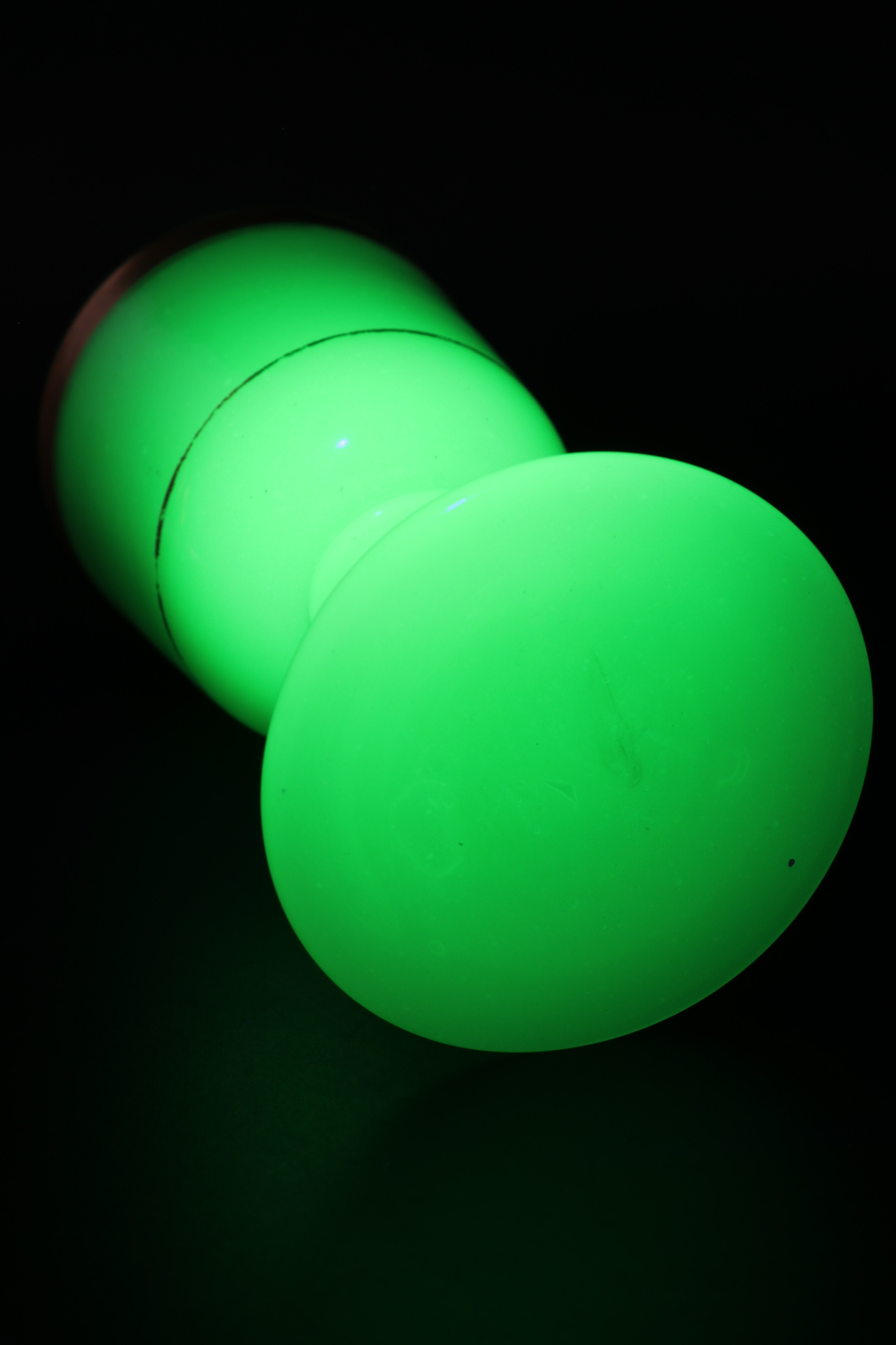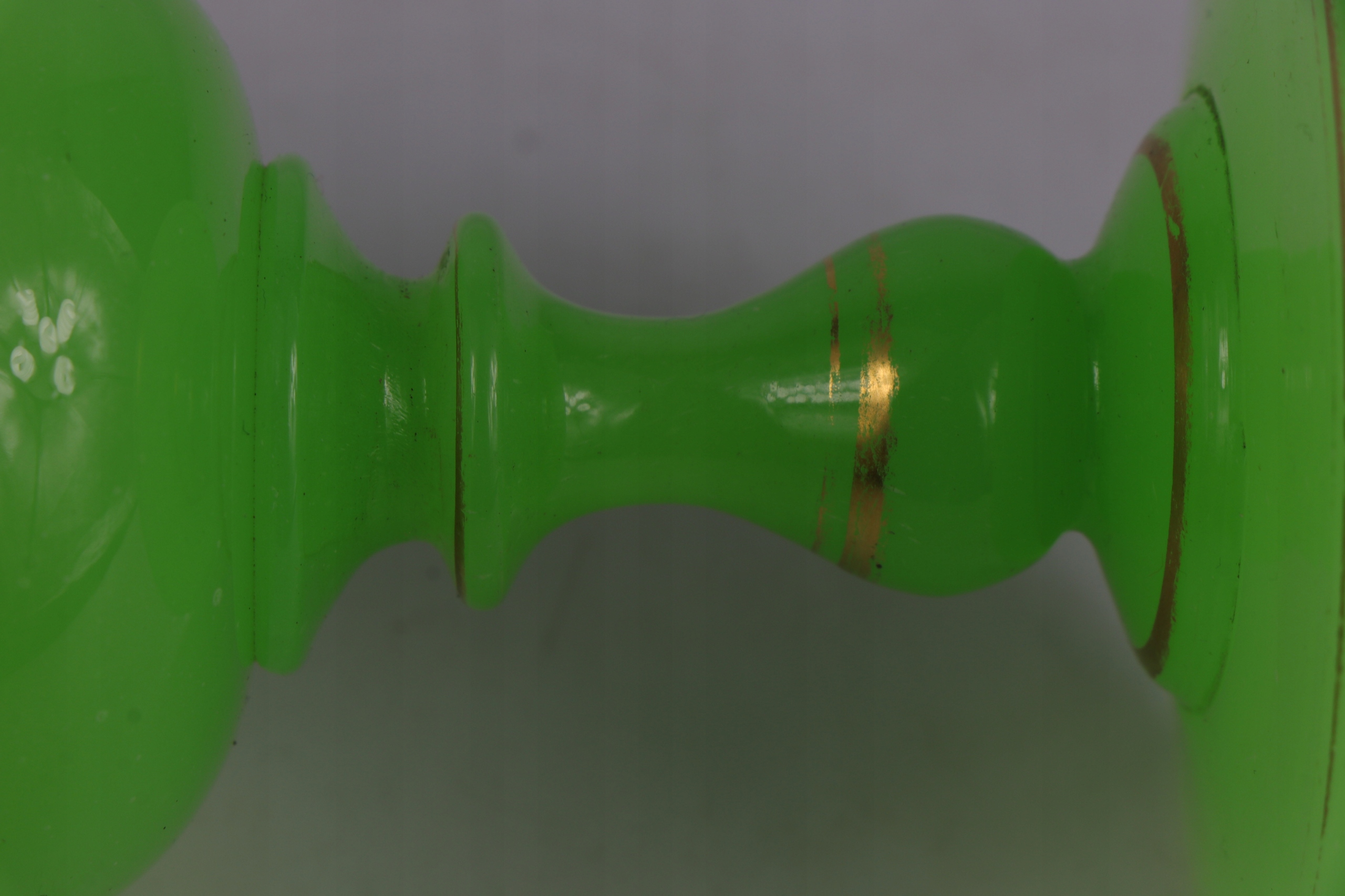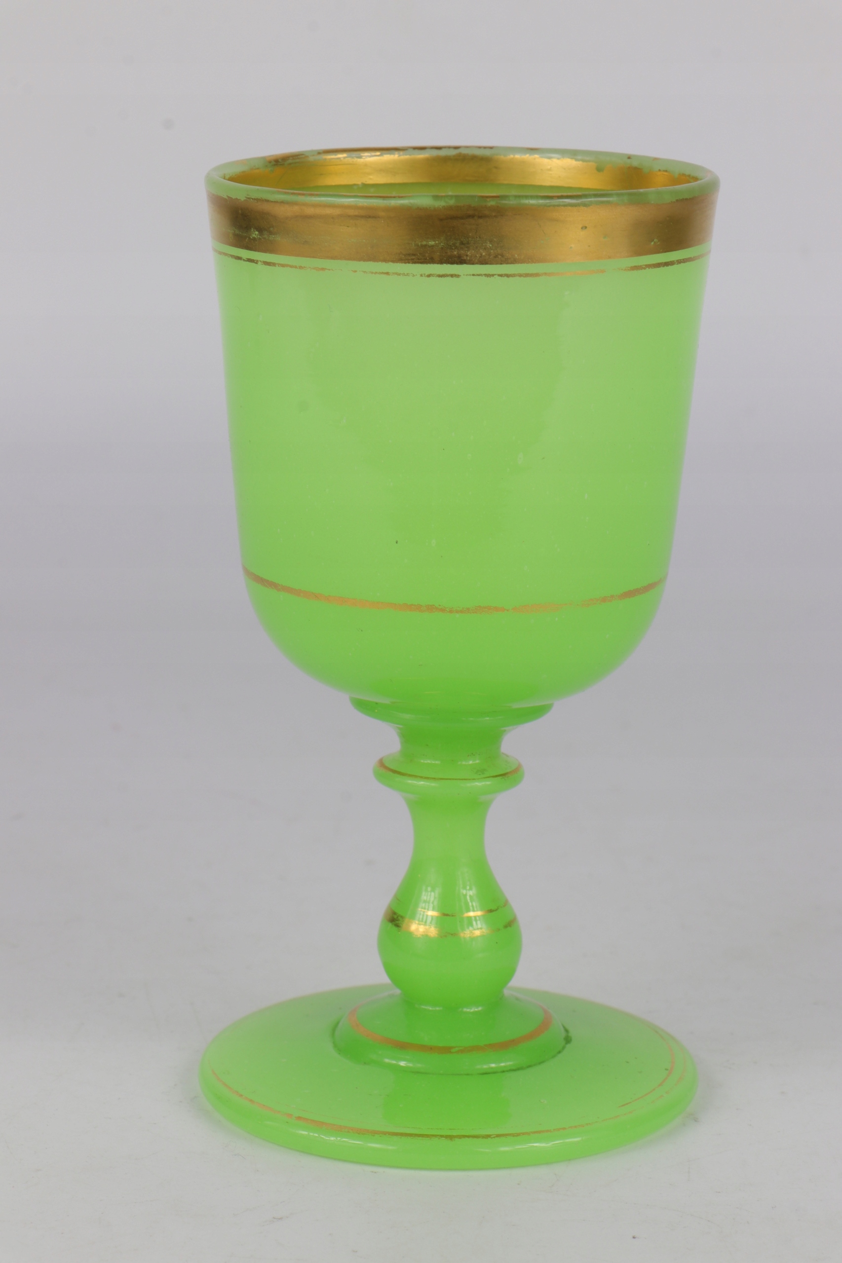 Чашка стекла из уранового стекла в характерном зеленом цвете. Густое массивное стекло, украшенное золотым орнаментом. Стекло с четко отшлифованным объективом на дне. Вторые и последние фотографии в ультрафиолетовом свете. Возможно, чашка немного старше с конца девятнадцатого века.