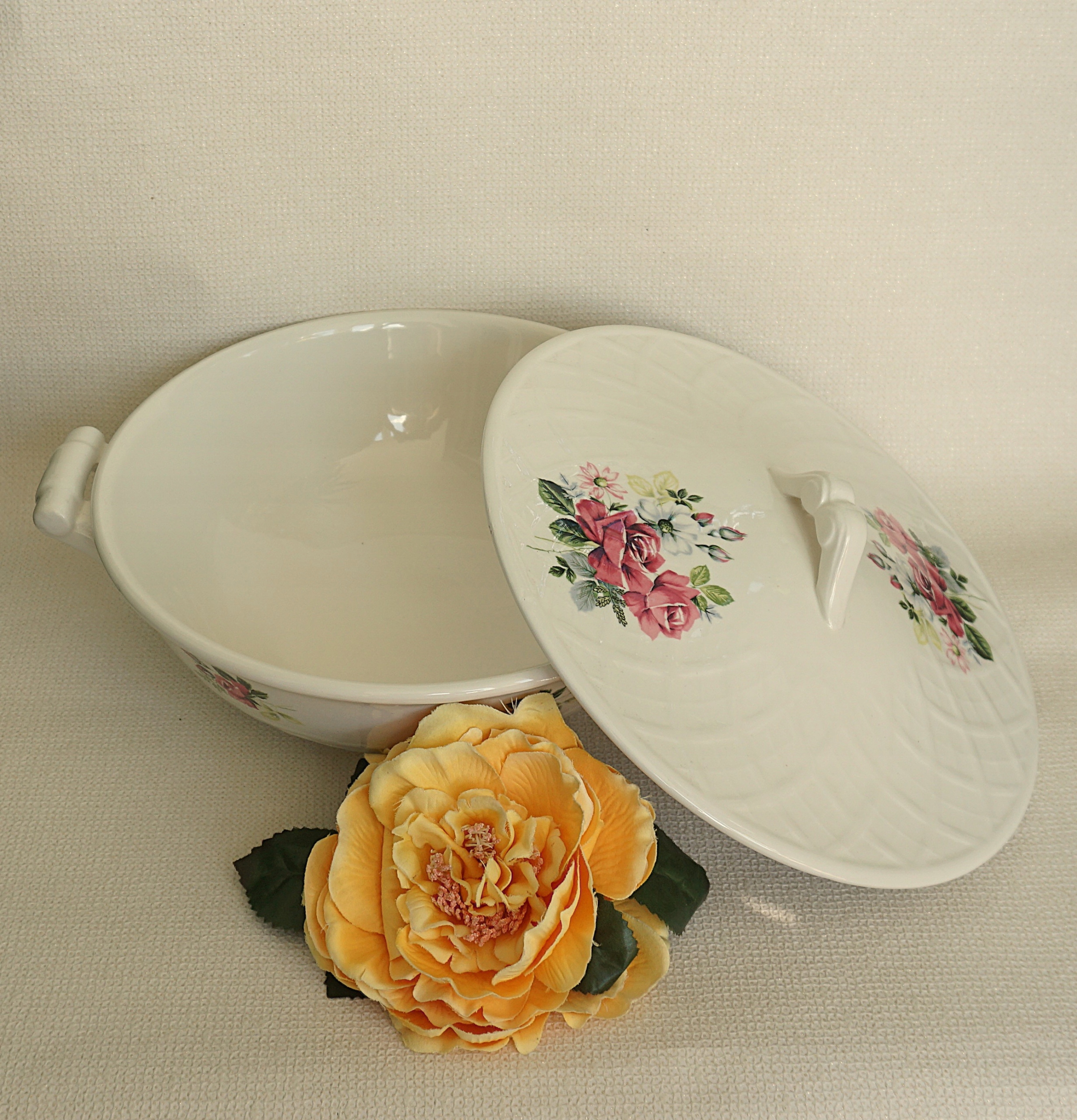 Фарфоровый цвет: разбитый белый. Декоративная поверхность рельефа. Оригинальные, утонченные ручки. На поверхности, украшение по заправке: букеты роз и полевых цветов.