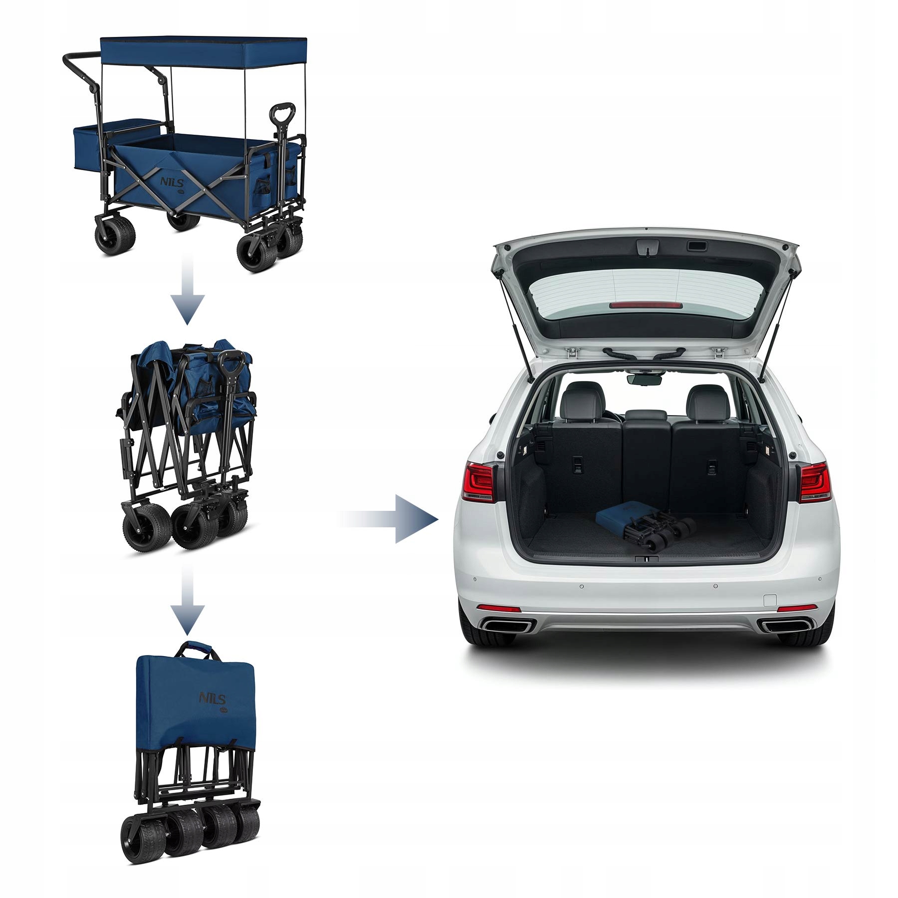 Практический и вместительный туристический тележки с вместимостью 120 кг и транспортного пространства 120 l , оснащенных большим полем. Идеально подходит для пляжа, кемпинга, магазинов или фестивалей - где бы вам нужен комфортный транспорт более крупного багажа.