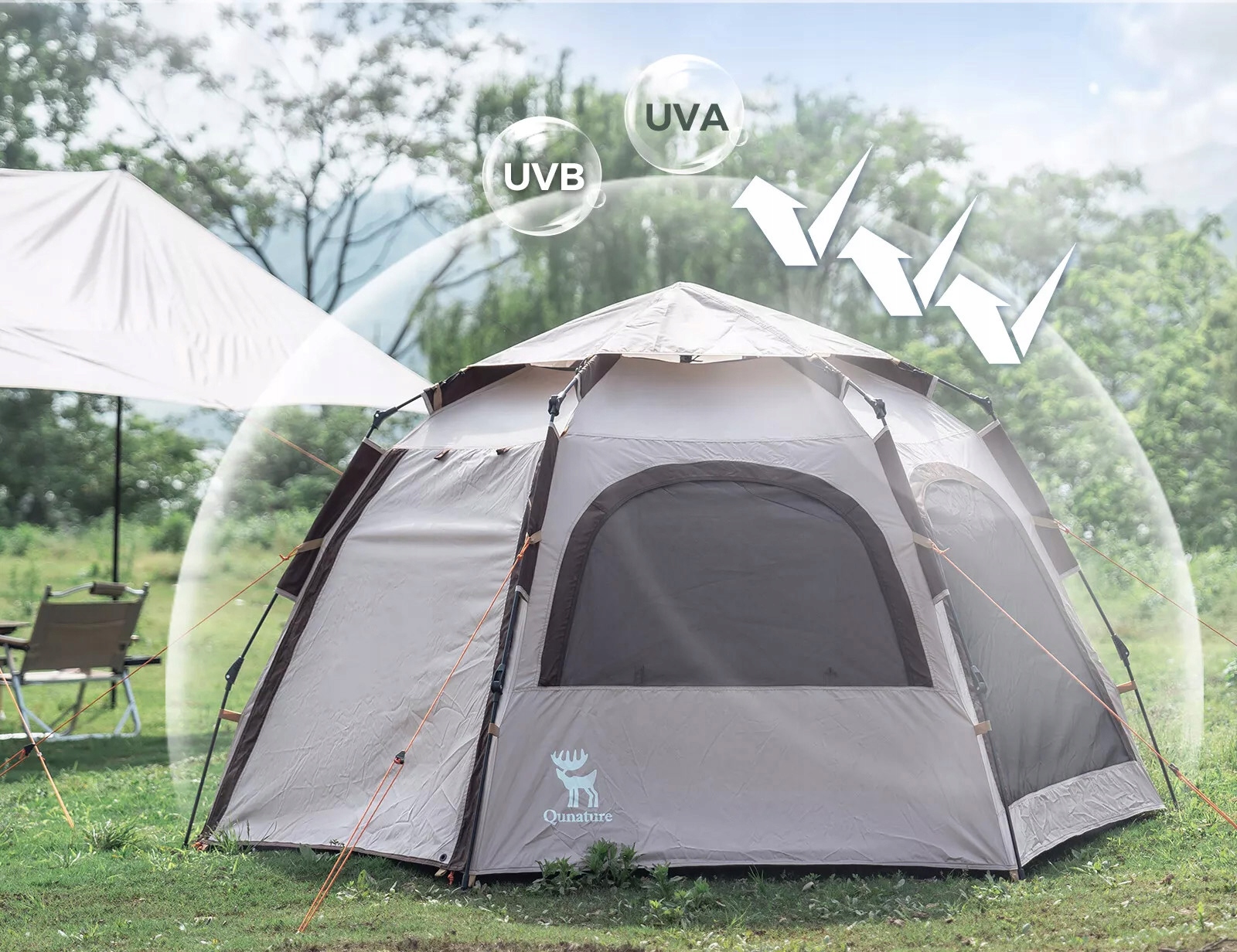 Эта семейная палатка изготовлена из полиэстера и ПУ и запечатанных швов, водонепроницаемой PU2000 мм, может защищать от мелких и средних дождей. Серебряный ультрафиолетовый, UPF50+, эффективно изолирует ультрафиолетовые лучи