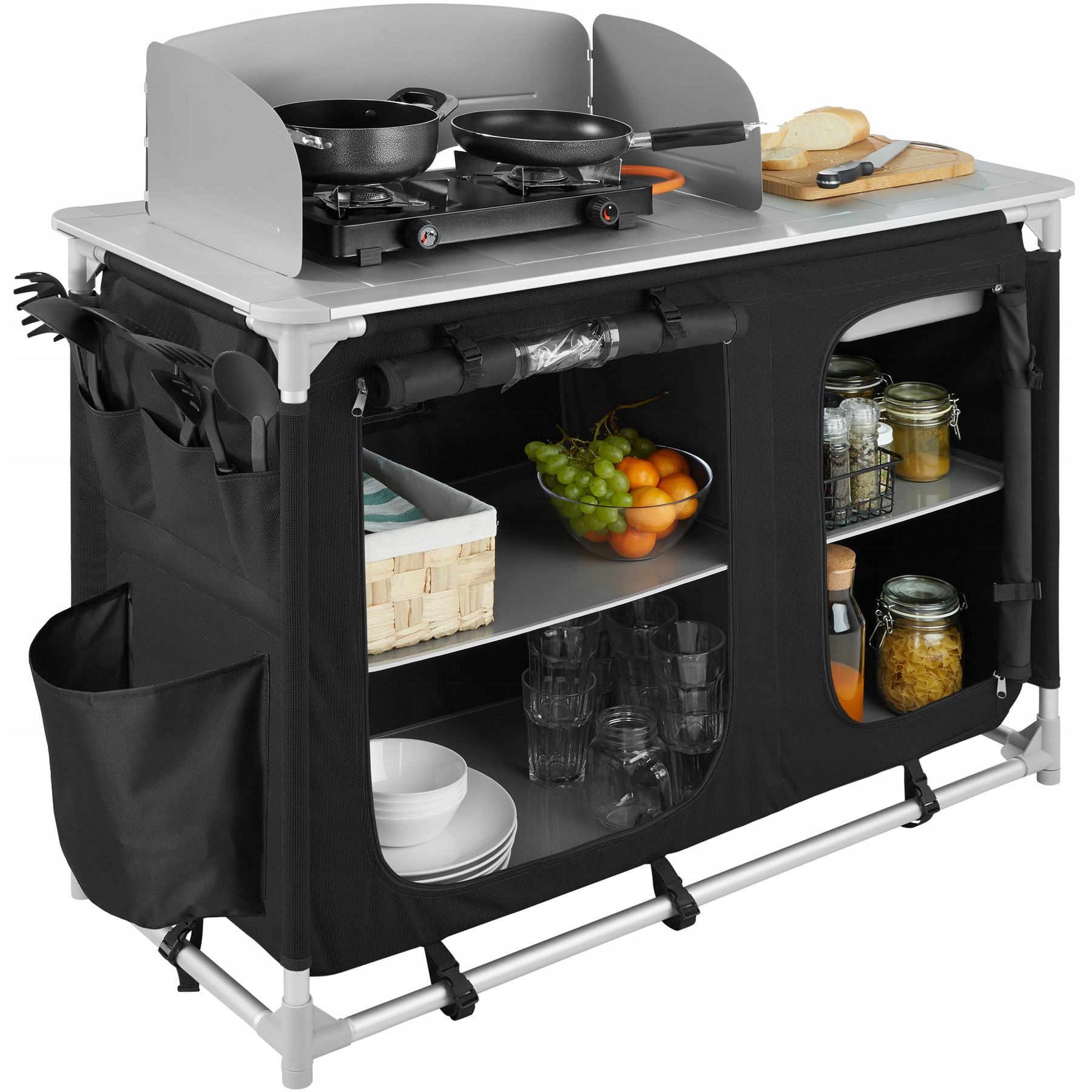 Походная кухня TecTake отличается продуманным дизайном. Центральным элементом этой модульной кухни является столешница с практичной ветрозащитой и закрытой раковиной. Для обеспечения хорошей вентиляции задние стенки двух просторных вещевых отделений частично выполнены из сетки. Прочная алюминиевая рама и регулируемые по высоте ножки гарантируют высокую устойчивость кухонного ящика. В сложенном виде эту легкую летнюю кухню можно транспортировать в прилагаемой сумке. Функциональная туристическая кухня: походная кухня TecTake.