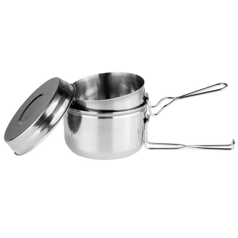 Практическая туристическая посуда – две кастрюли и крышка. Незаменим для кемпинга и длительных поездок. Все это заключено в один самый большой сосуд.