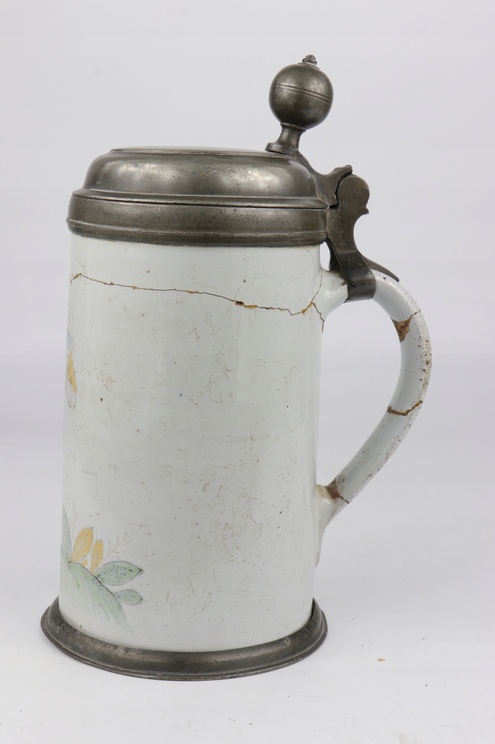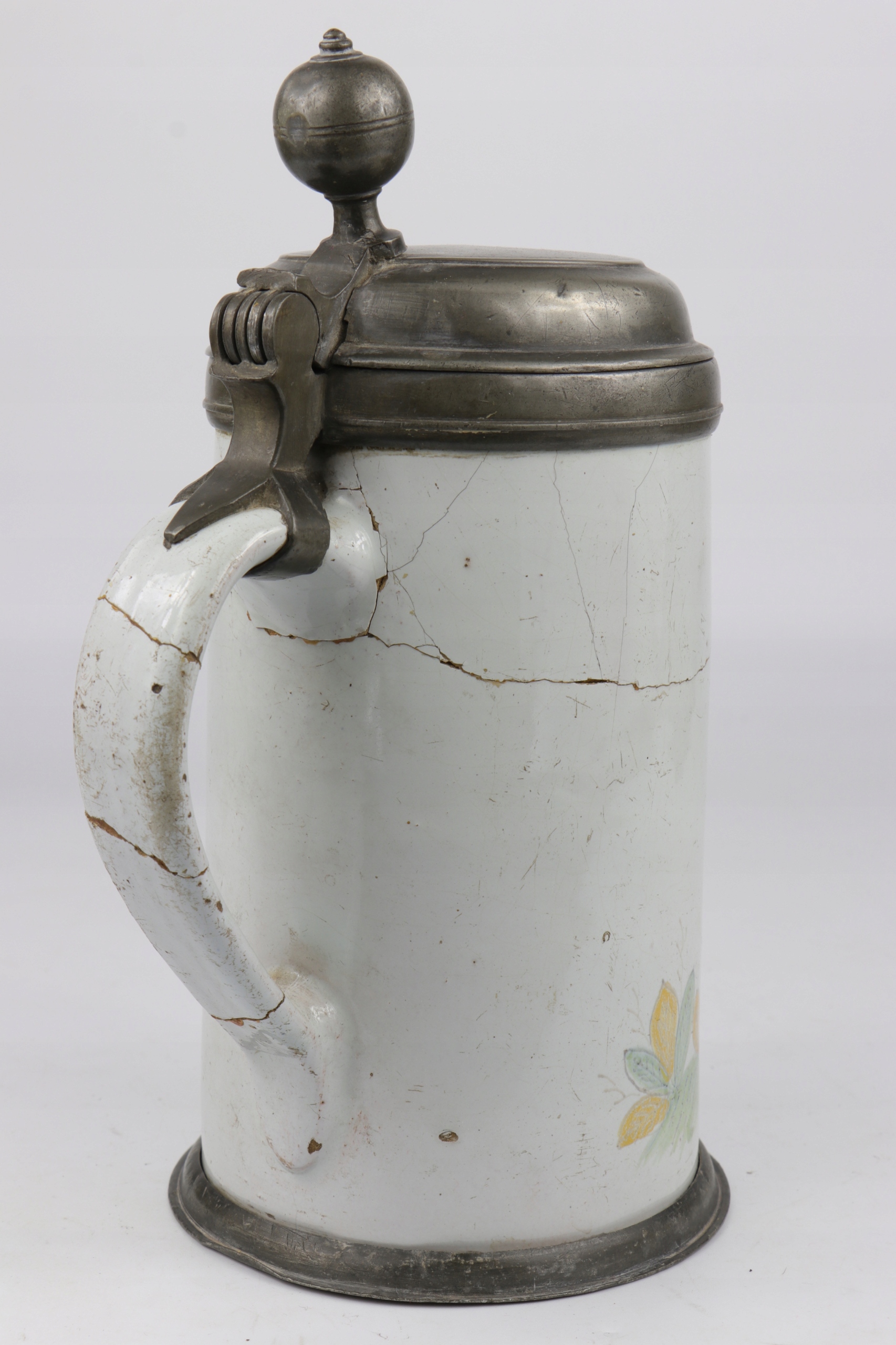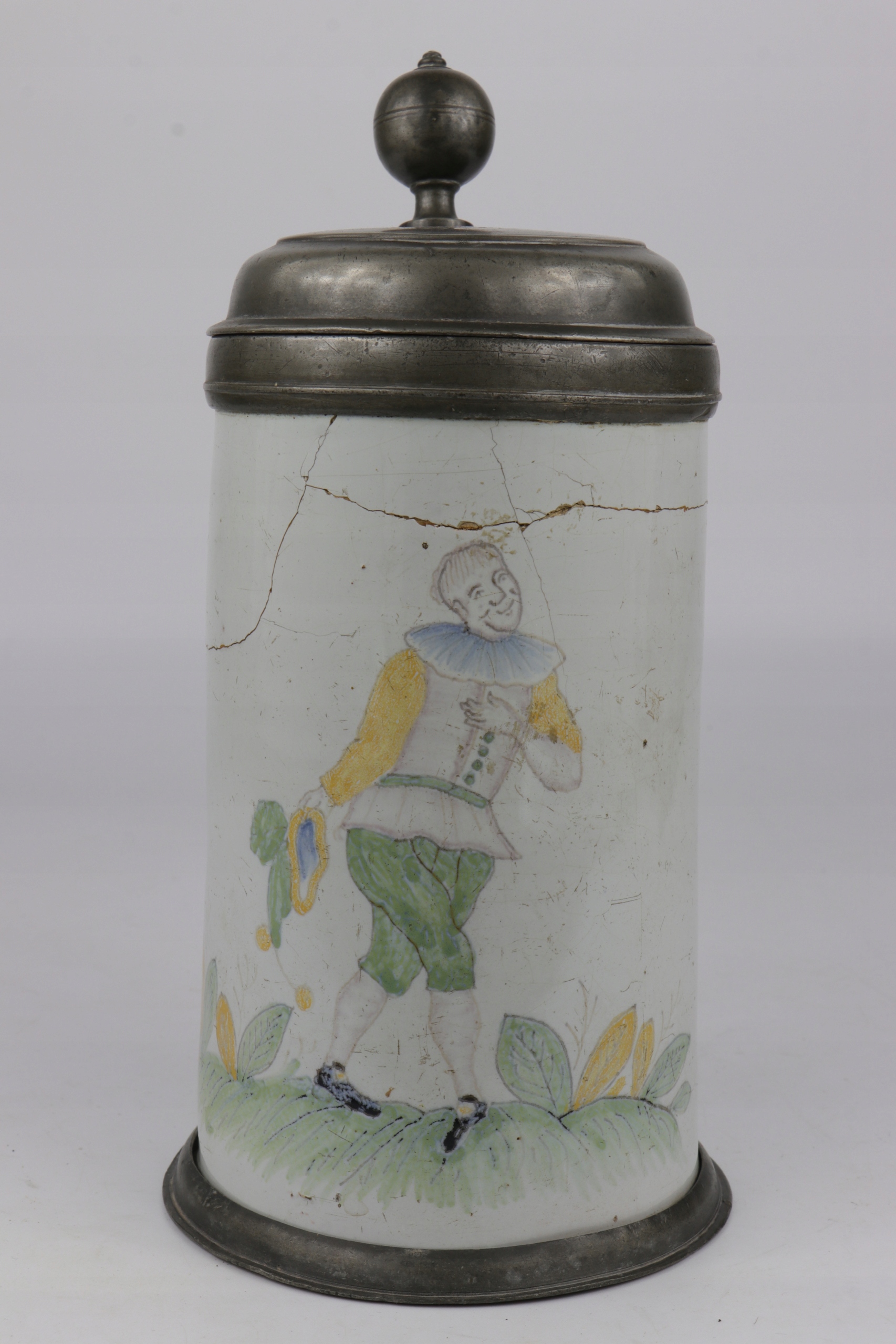 Очень интересная и редкая музейная керамическая кружка с жестяной крышкой. На крышке инициалы и дата 1768. Кружка украшена нарисованной вручную фигуркой Пьеро.