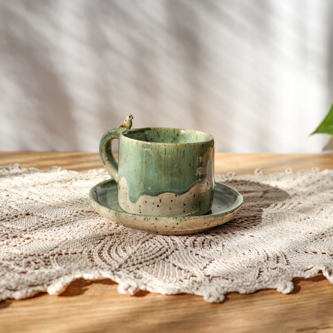 Керамическая чашка для эспрессо - Ptaszek с блюдцем, емкость 60мл, создана для маленьких радостей. Ручная работа из светло-бежевой глины, с мелкими коричневыми веснушками. Покрыта посередине, по краю и на блюдце глазурью шалфейного цвета. Украшена очаровательной керамической птичкой, сидящей на ушке.
