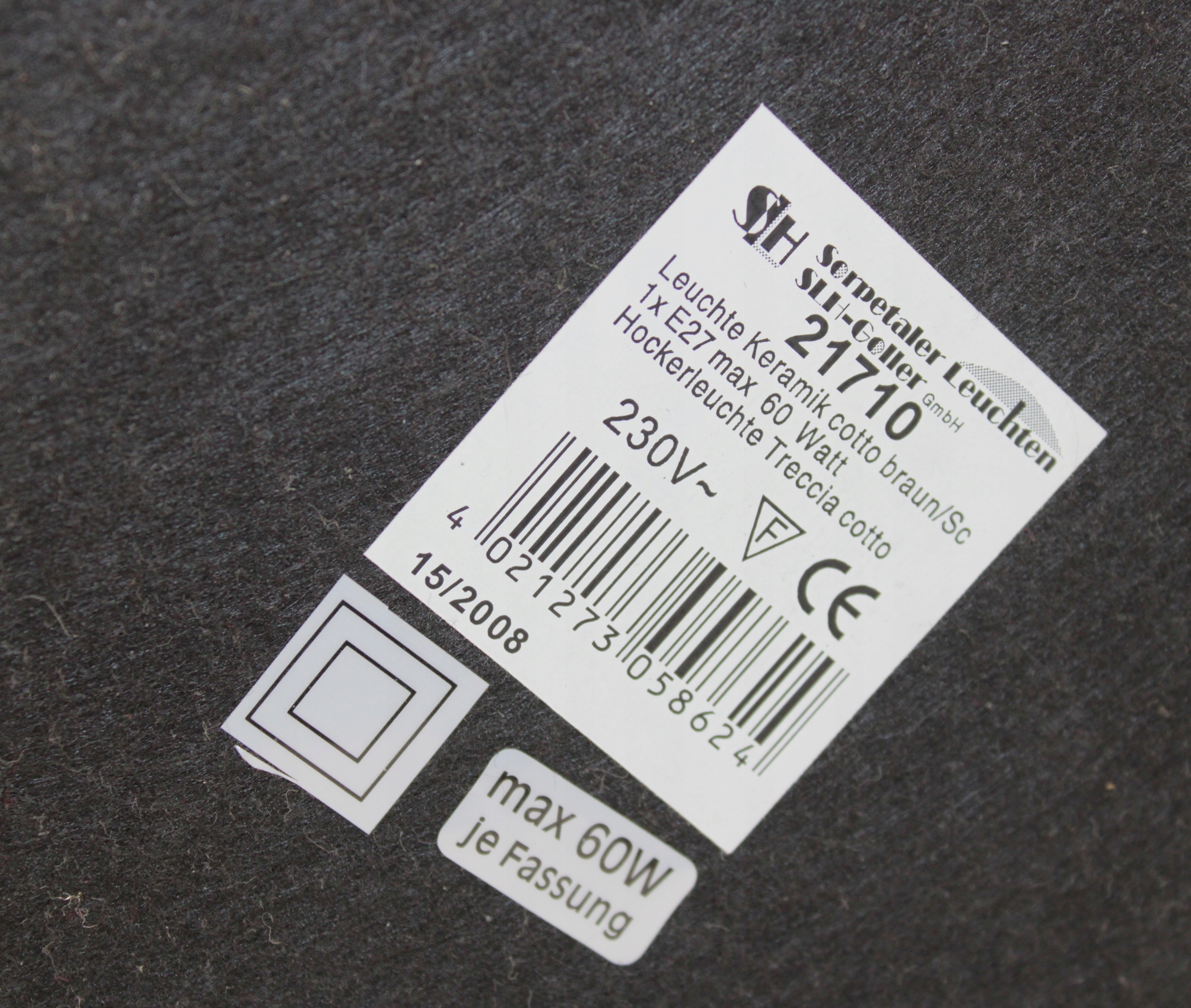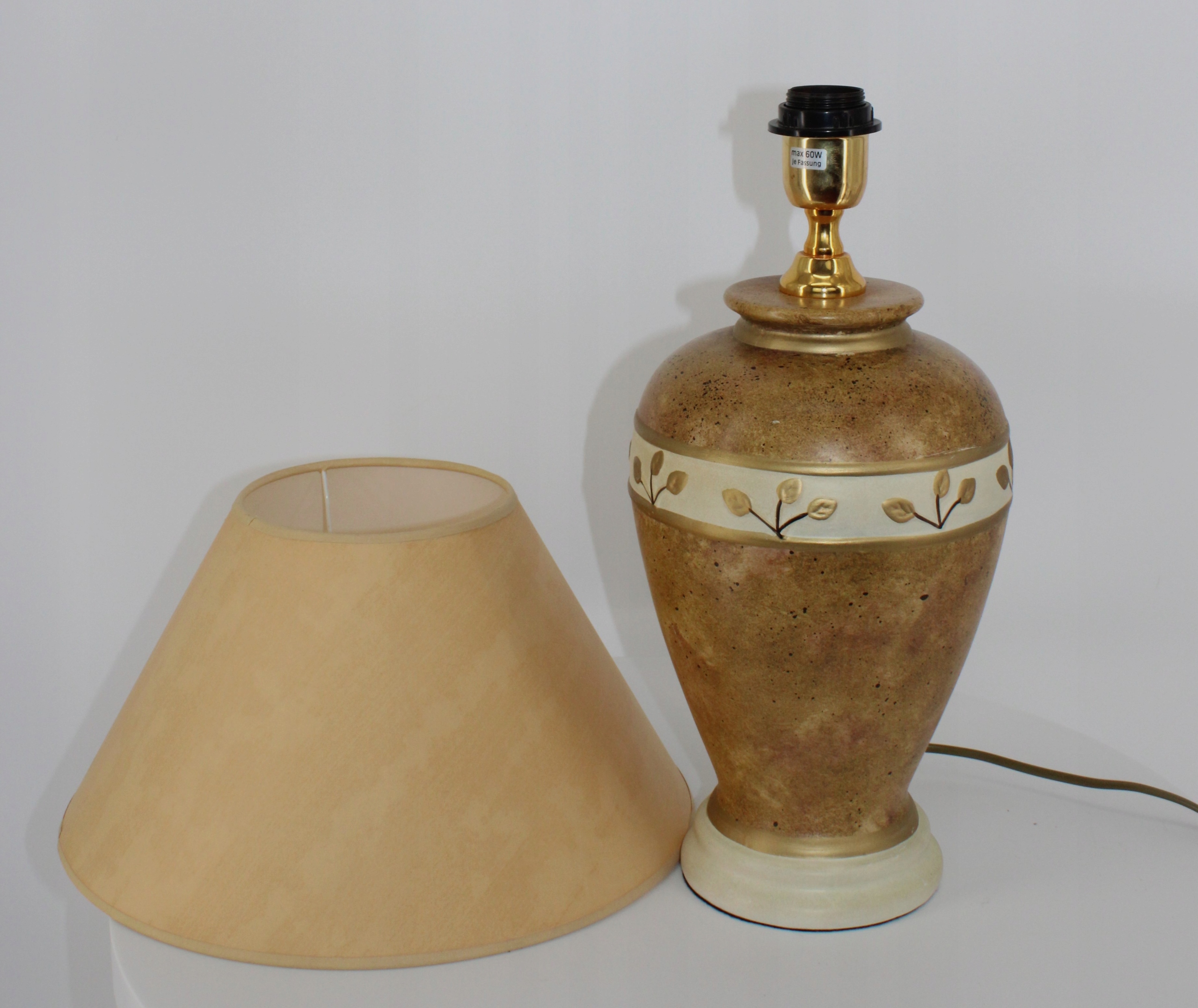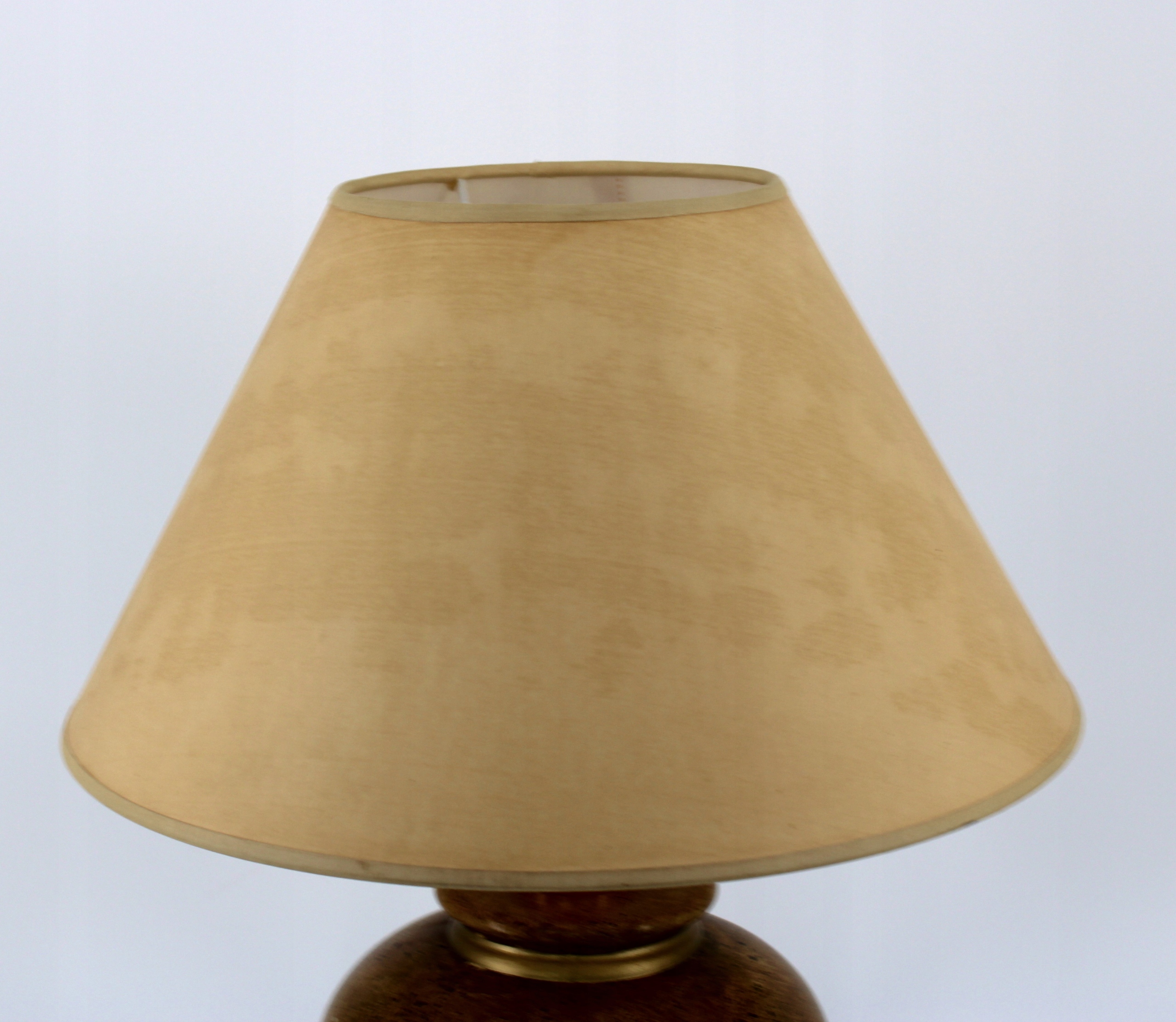 Настольная лампа керамическая, коричнево-золотая, производство Германия. Переключатель установлен на кабеле. Источник света – 1 лампочка с большой резьбой Е27 (в комплект не входит). Абажур цвета экрю, на материале есть потертости.