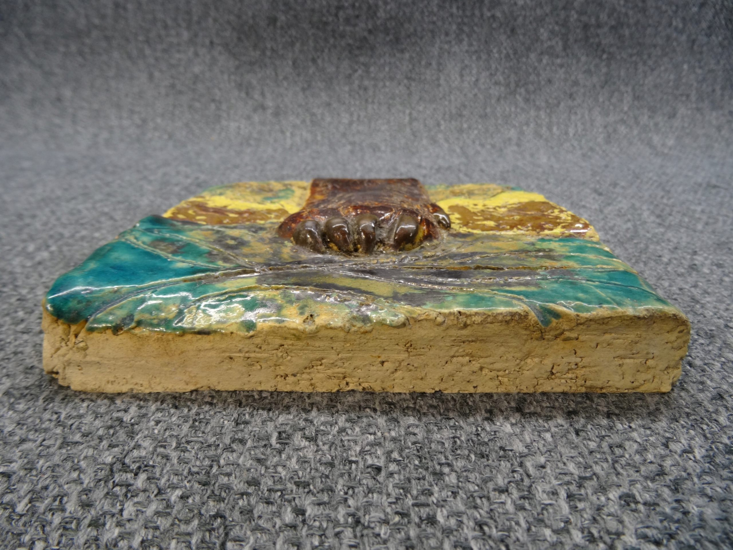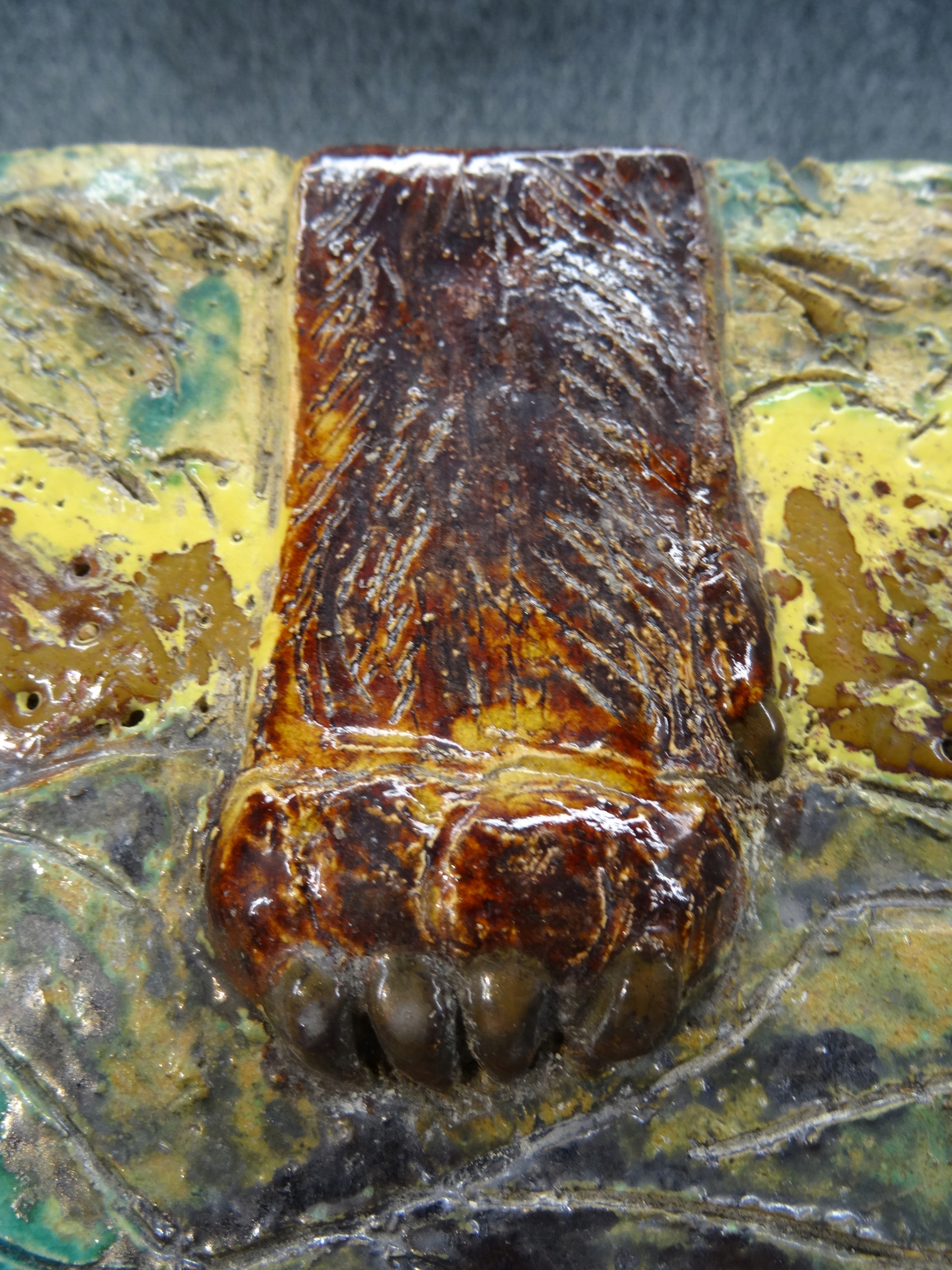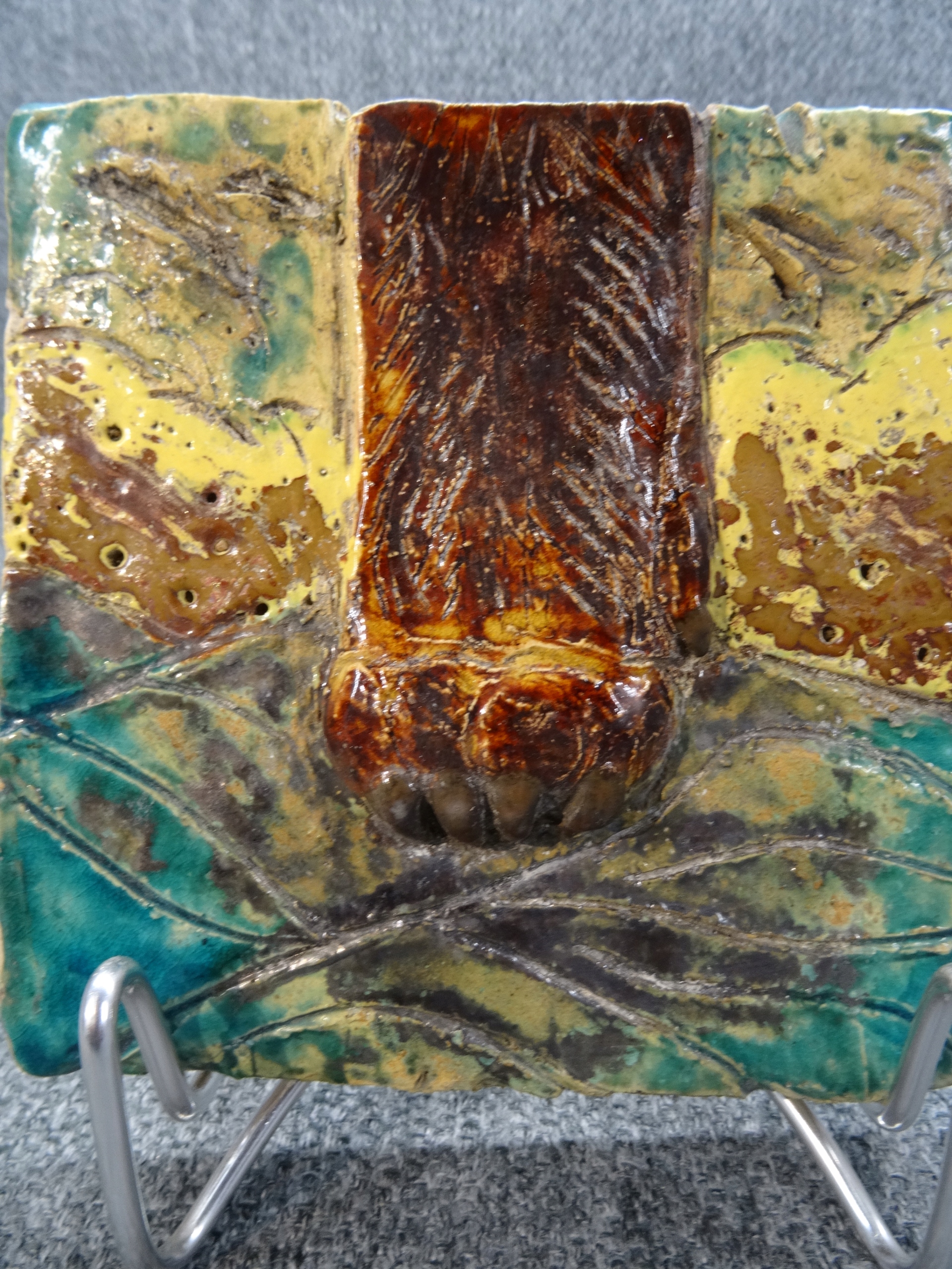 Керамическая плитка с представлением лапы животного медведя, кота? Кафель красиво окрашен.