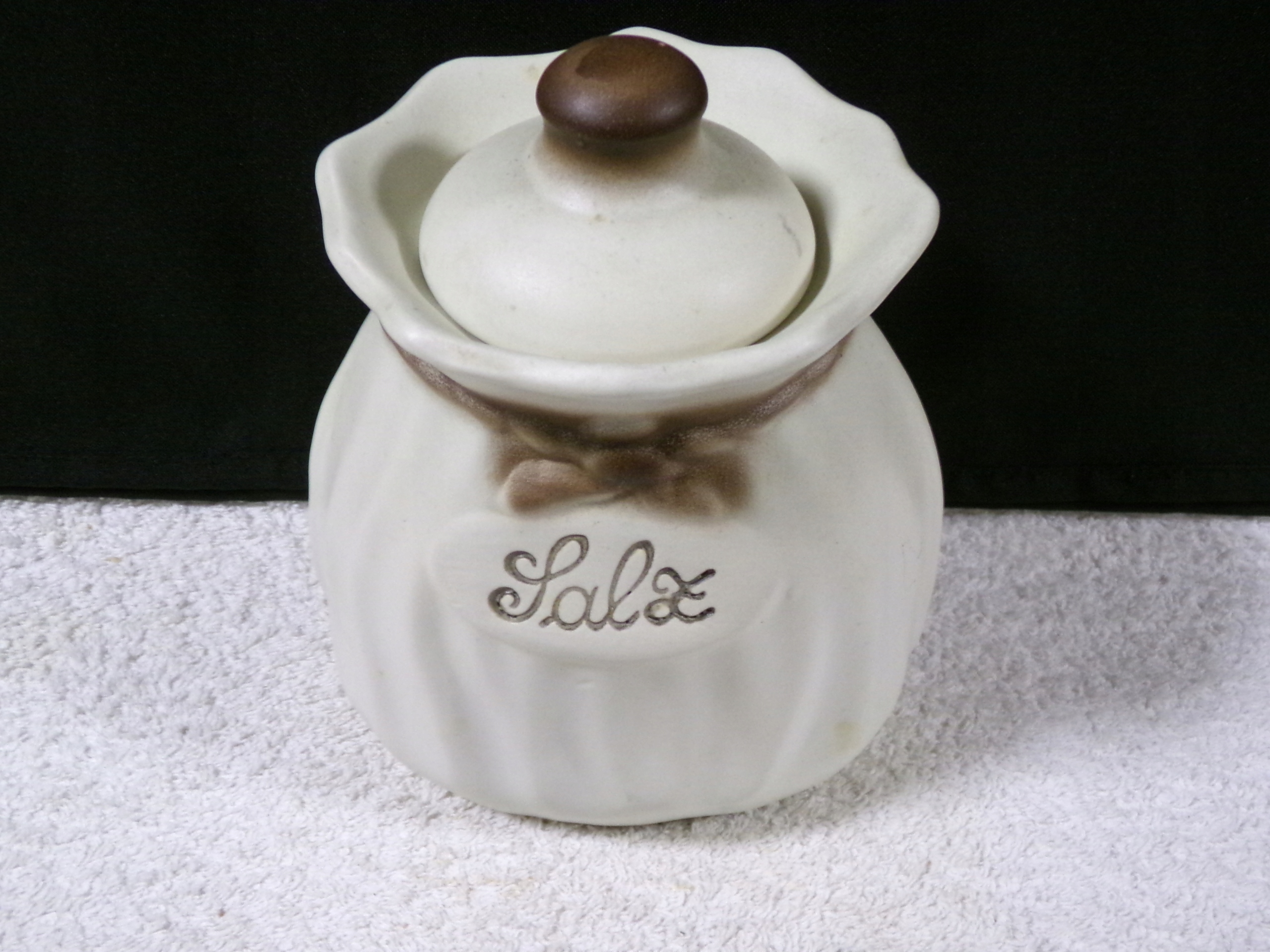 Контейнер для соли цельный керамический, высота 18,5 см, диаметр 13,5х10,5 см, вес 0,94 кг. В очень хорошем состоянии, без повреждений.