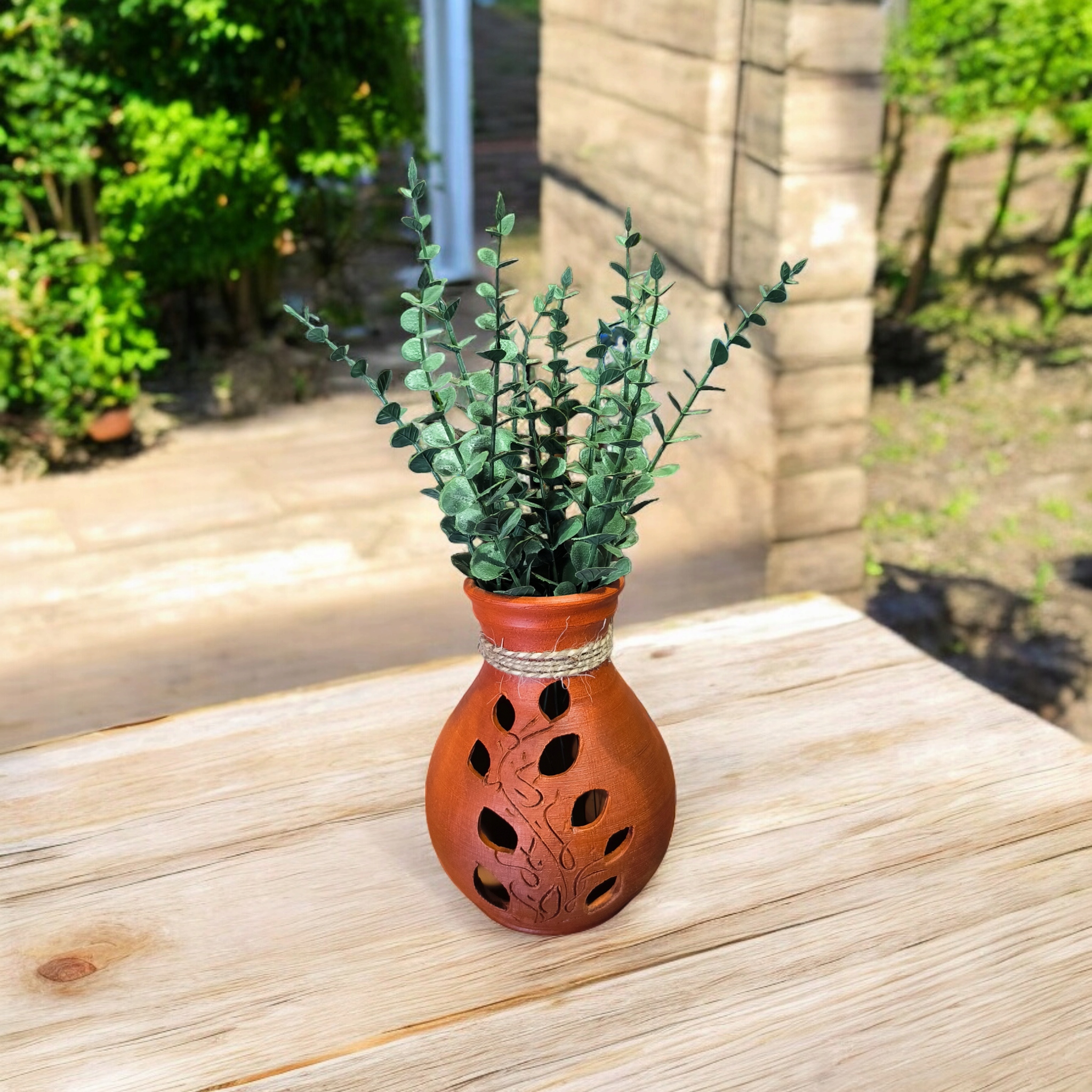 Ваза выполнена в кирпичном цвете, что придает ей естественный и деревенский вид. Благодаря ручной работе каждое изделие имеет свой уникальный характер, а тщательная обработка обеспечивает долговечность и элегантность. Дополнительный акцент – стильный шнурок, обвивающий горлышко вазы, что придает ей еще больше шарма.