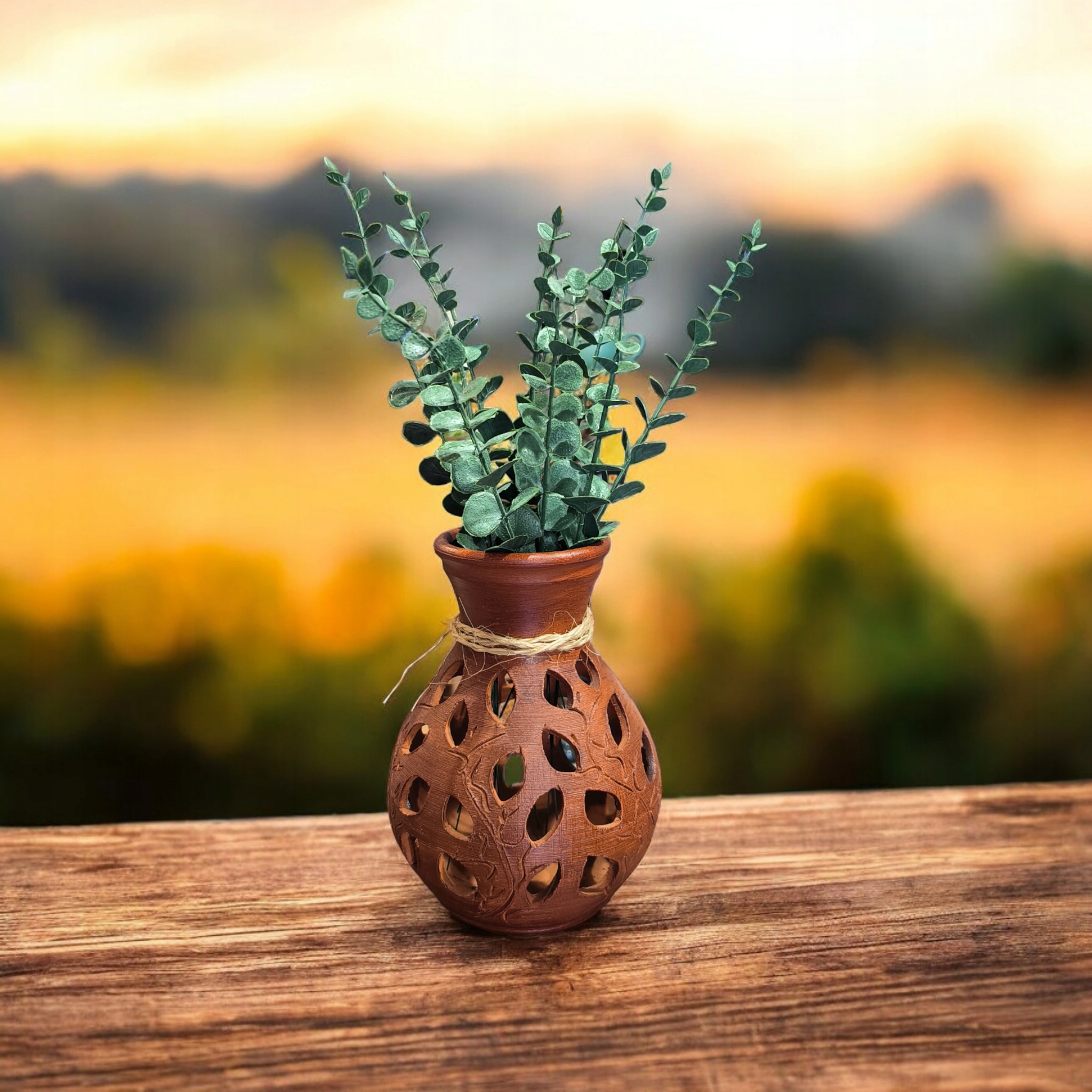 Ваза выполнена в кирпичном цвете, что придает ей естественный и деревенский вид. Благодаря ручной работе каждое изделие имеет свой уникальный характер, а тщательная обработка обеспечивает долговечность и элегантность. Дополнительный акцент – стильный шнурок, обвивающий горлышко вазы, что придает ей еще больше шарма.