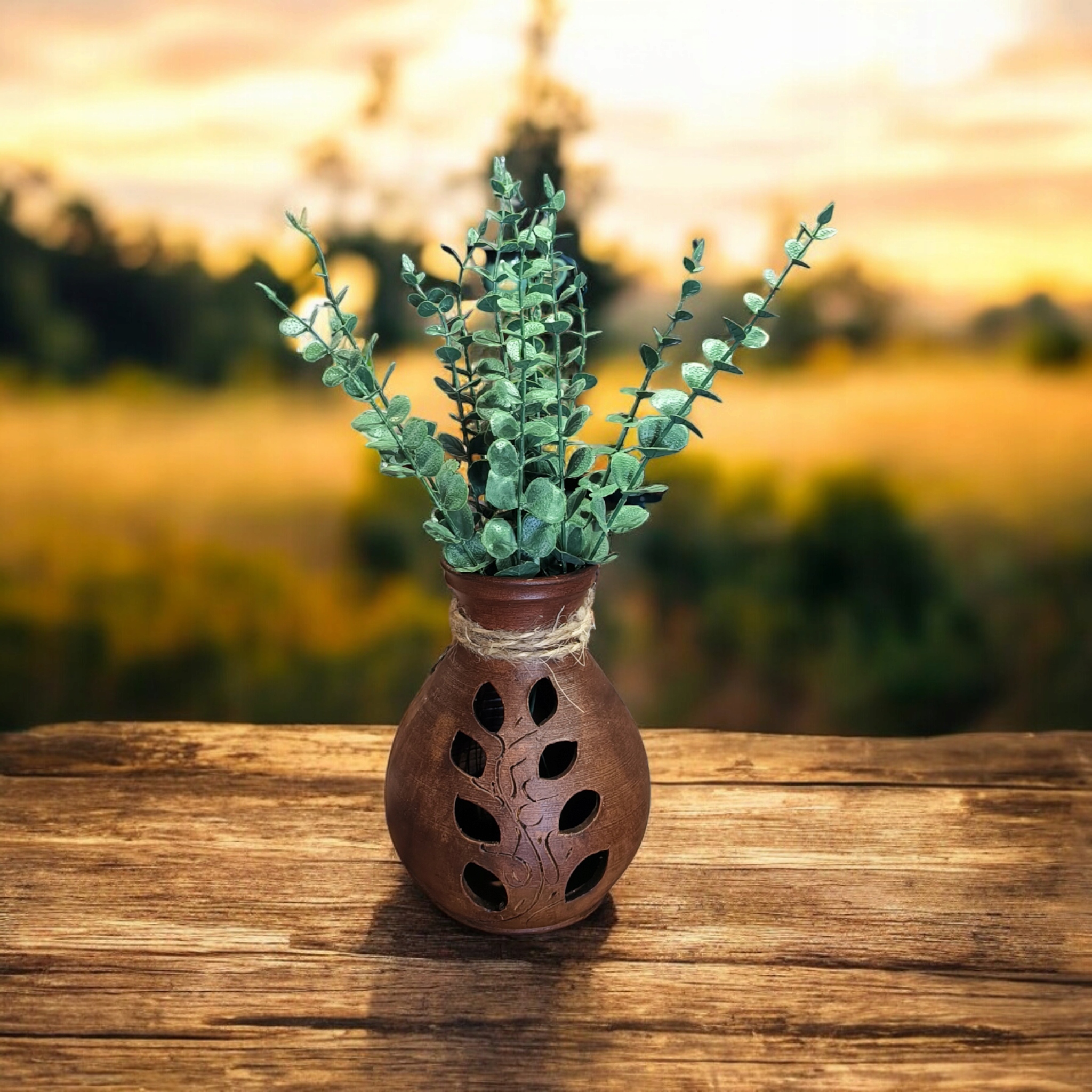 Ваза коричневого цвета, что придает ей естественный и деревенский вид. Благодаря ручной работе каждое изделие имеет свой уникальный характер, а тщательная обработка обеспечивает долговечность и элегантность. Дополнительный акцент – стильный шнурок, обвивающий горлышко вазы, что придает ей еще больше шарма.