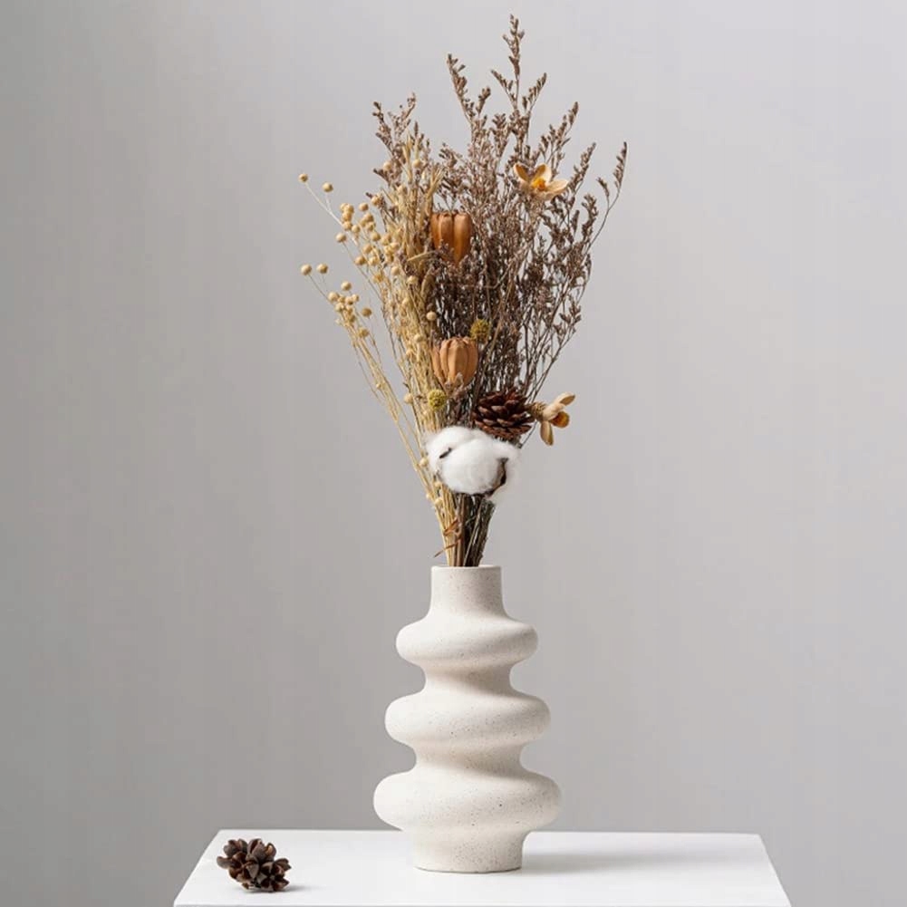 Ваза необычной формы, волнистая, слегка расширяющаяся книзу. Имеет узкий вход. Летом в него можно положить живые цветы и полить водой. Также подойдет для сухоцветов, пампасных трав и композиций.