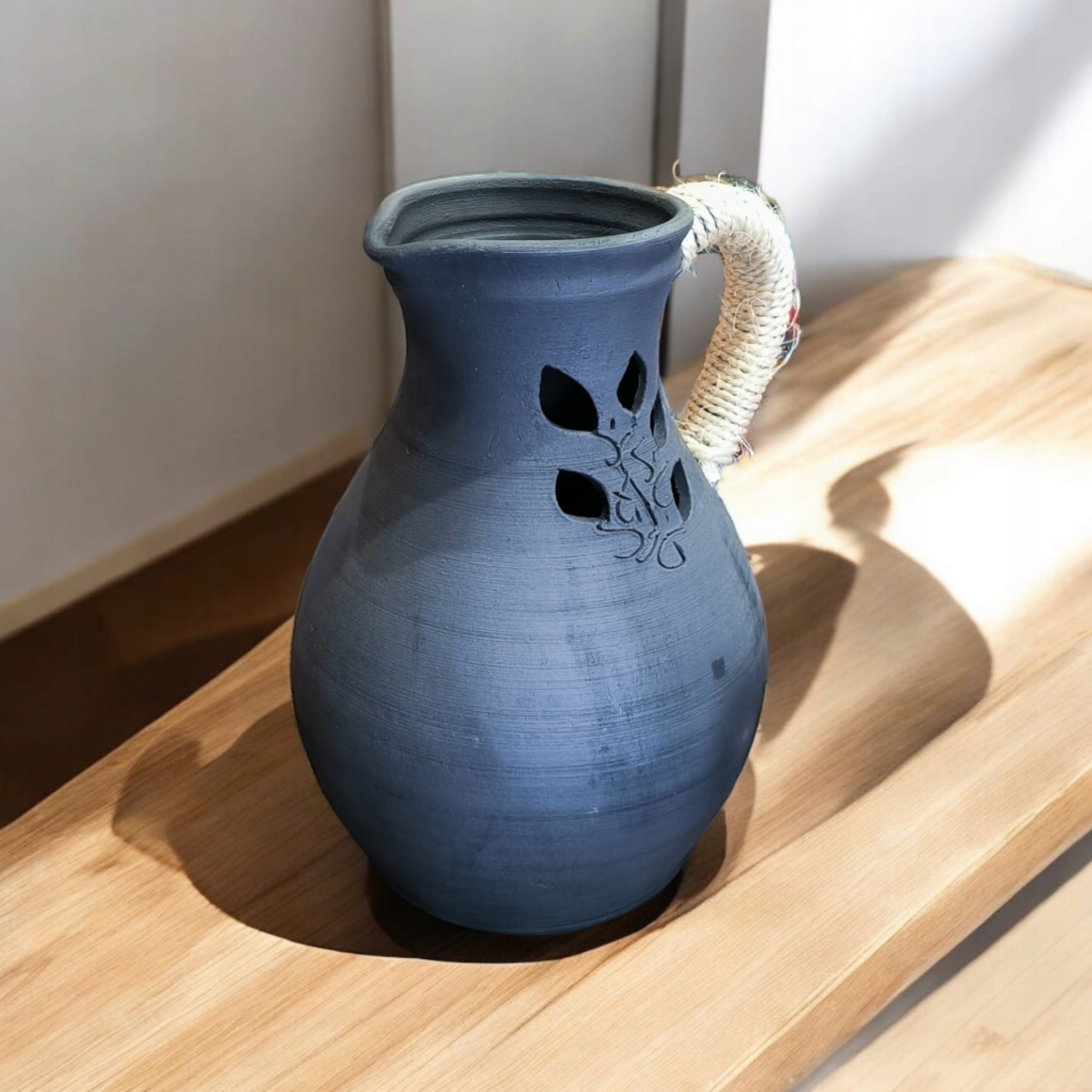 Ваза серого цвета (Сивак), что придает ей естественный и деревенский вид. Благодаря ручной работе каждое изделие имеет свой уникальный характер, а тщательная обработка обеспечивает долговечность и элегантность. Дополнительный акцент – стильная веревка, обмотанная вокруг ручки вазы, что придает ей еще больше шарма.