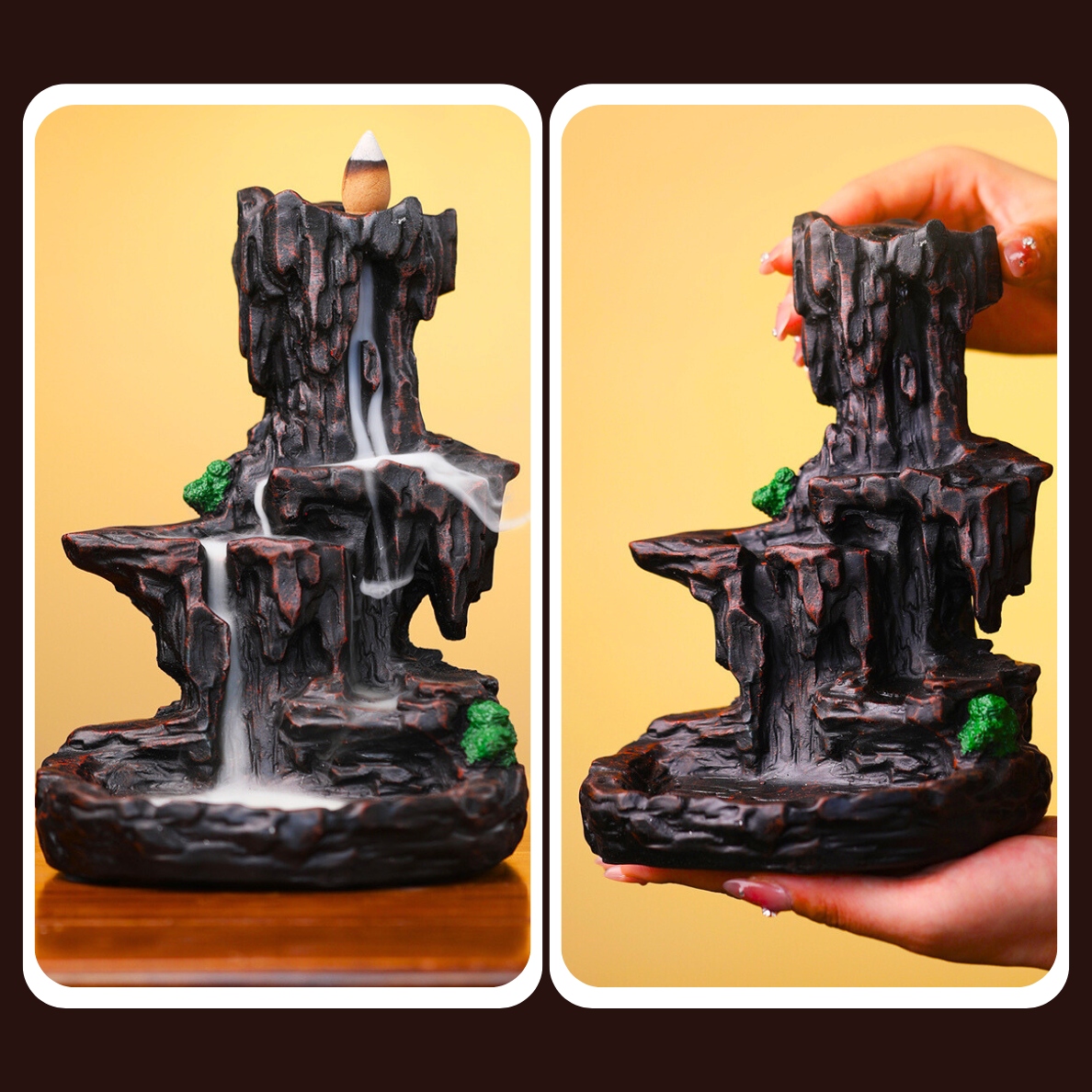 Камин выступает в качестве источника ароматерапии и украшения. Просто зажгите благовония наверху, чтобы насладиться не только приятным запахом, но и визуальным эффектом, напоминающим струящийся водопад. Благодаря сменным ароматическим палочкам вы можете выбирать разные ароматы, которые придадут вам энергии в течение дня или будут способствовать расслаблению вечером. Такой двойной режим использования делает камин универсальным дополнением к каждому дому.